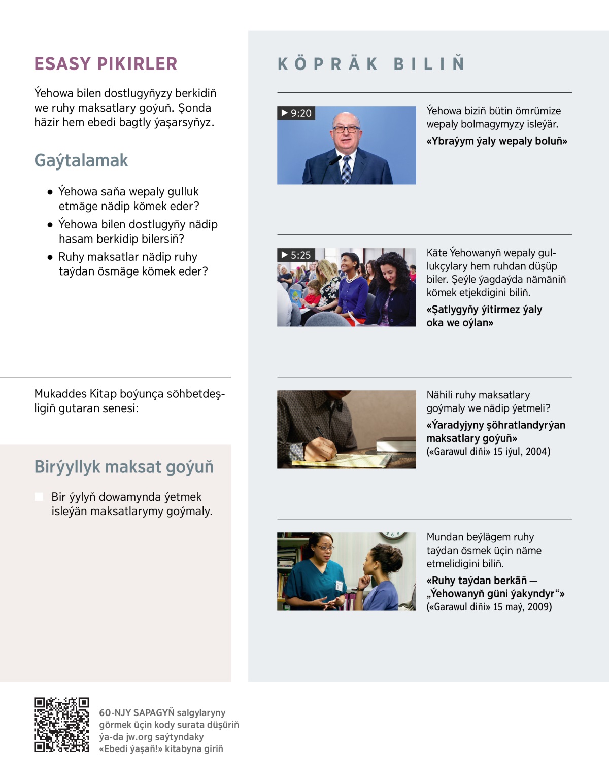 Ýehowa köpräk gulluk etmegi maksat goýsaň, bir ýerde durmarsyň, ruhy taýdan ösersiň. WIDEONY görüp, aşakdaky sorag boýunça gürrüňdeş boluň.