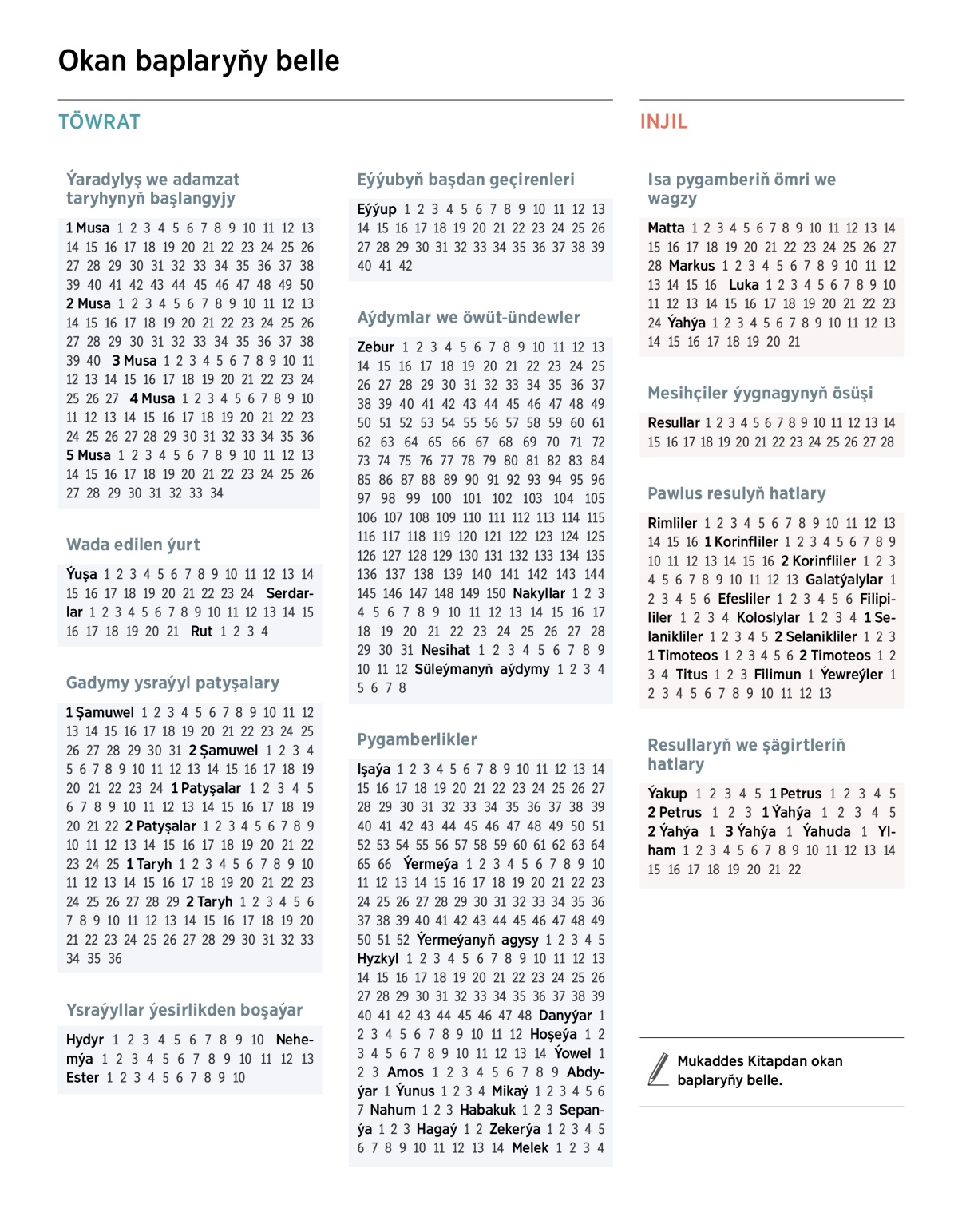 Okan baplaryňy belle Çap edilen görnüşi Ýaradylyş we adamzat taryhynyň başlangyjy Wada edilen ýurt Gadymy ysraýyl patyşalary Ysraýyllar ýesirlikden boşaýar Eýýubyň başdan geçirenleri Aýdymlar we öwüt-ündewler Pygamberlikler Isa pygamberiň ömri we wagzy Mesihçiler ýygnagynyň ösüşi Pawlus resulyň hatlary Resullaryň we şägirtleriň hatlary Mukaddes Kitapdan okan baplaryňy belle. TÖWRAT Ýaradylyş we adamzat taryhynyň başlangyjy 1 Musa 1 2 3 4 5 6 7 8 9 10 11 12 13 14 15 16 17 18 19 20 21 22 23 24 25 26 27 28 29 30 31 32 33 34 35 36 37 38 39 40 41 42 43 44 45 46 47 48 49 50 2 Musa 1 2 3 4 5 6 7 8 9 10 11 12 13 14 15 16 17 18 19 20 21 22 23 24 25 26 27 28 29 30 31 32 33 34 35 36 37 38 39 40 3 Musa 1 2 3 4 5 6 7 8 9 10 11 12 13 14 15 16 17 18 19 20 21 22 23 24 25 26 27 4 Musa 1 2 3 4 5 6 7 8 9 10 11 12 13 14 15 16 17 18 19 20 21 22 23 24 25 26 27 28 29 30 31 32 33 34 35 36 5 Musa 1 2 3 4 5 6 7 8 9 10 11 12 13 14 15 16 17 18 19 20 21 22 23 24 25 26 27 28 29 30 31 32 33 34 Wada edilen ýurt Ýuşa 1 2 3 4 5 6 7 8 9 10 11 12 13 14 15 16 17 18 19 20 21 22 23 24 Serdarlar 1 2 3 4 5 6 7 8 9 10 11 12 13 14 15 16 17 18 19 20 21 Rut 1 2 3 4 Gadymy ysraýyl patyşalary 1 Şamuwel 1 2 3 4 5 6 7 8 9 10 11 12 13 14 15 16 17 18 19 20 21 22 23 24 25 26 27 28 29 30 31 2 Şamuwel 1 2 3 4 5 6 7 8 9 10 11 12 13 14 15 16 17 18 19 20 21 22 23 24 1 Patyşalar 1 2 3 4 5 6 7 8 9 10 11 12 13 14 15 16 17 18 19 20 21 22 2 Patyşalar 1 2 3 4 5 6 7 8 9 10 11 12 13 14 15 16 17 18 19 20 21 22 23 24 25 1 Taryh 1 2 3 4 5 6 7 8 9 10 11 12 13 14 15 16 17 18 19 20 21 22 23 24 25 26 27 28 29 2 Taryh 1 2 3 4 5 6 7 8 9 10 11 12 13 14 15 16 17 18 19 20 21 22 23 24 25 26 27 28 29 30 31 32 33 34 35 36 Ysraýyllar ýesirlikden boşaýar Hydyr 1 2 3 4 5 6 7 8 9 10 Nehemýa 1 2 3 4 5 6 7 8 9 10 11 12 13 Ester 1 2 3 4 5 6 7 8 9 10 Eýýubyň başdan geçirenleri Eýýup 1 2 3 4 5 6 7 8 9 10 11 12 13 14 15 16 17 18 19 20 21 22 23 24 25 26 27 28 29 30 31 32 33 34 35 36 37 38 39 40 41 42 Aýdymlar we öwüt-ündewler Zebur 1 2 3 4 5 6 7 8 9 10 11 12 13 14 15 16 17 18 19 20 21 22 23 24 25 26 27 28 29 30 31 32 33 34 35 36 37 38 39 40 41 42 43 44 45 46 47 48 49 50 51 52 53 54 55 56 57 58 59 60 61 62 63 64 65 66 67 68 69 70 71 72 73 74 75 76 77 78 79 80 81 82 83 84 85 86 87 88 89 90 91 92 93 94 95 96 97 98 99 100 101 102 103 104 105 106 107 108 109 110 111 112 113 114 115 116 117 118 119 120 121 122 123 124 125 126 127 128 129 130 131 132 133 134 135 136 137 138 139 140 141 142 143 144 145 146 147 148 149 150 Nakyllar 1 2 3 4 5 6 7 8 9 10 11 12 13 14 15 16 17 18 19 20 21 22 23 24 25 26 27 28 29 30 31 Nesihat 1 2 3 4 5 6 7 8 9 10 11 12 Süleýmanyň aýdymy 1 2 3 4 5 6 7 8 Pygamberlikler Işaýa 1 2 3 4 5 6 7 8 9 10 11 12 13 14 15 16 17 18 19 20 21 22 23 24 25 26 27 28 29 30 31 32 33 34 35 36 37 38 39 40 41 42 43 44 45 46 47 48 49 50 51 52 53 54 55 56 57 58 59 60 61 62 63 64 65 66 Ýermeýa 1 2 3 4 5 6 7 8 9 10 11 12 13 14 15 16 17 18 19 20 21 22 23 24 25 26 27 28 29 30 31 32 33 34 35 36 37 38 39 40 41 42 43 44 45 46 47 48 49 50 51 52 Ýermeýanyň agysy 1 2 3 4 5 Hyzkyl 1 2 3 4 5 6 7 8 9 10 11 12 13 14 15 16 17 18 19 20 21 22 23 24 25 26 27 28 29 30 31 32 33 34 35 36 37 38 39 40 41 42 43 44 45 46 47 48 Danyýar 1 2 3 4 5 6 7 8 9 10 11 12 Hoşeýa 1 2 3 4 5 6 7 8 9 10 11 12 13 14 Ýowel 1 2 3 Amos 1 2 3 4 5 6 7 8 9 Abdyýar 1 Ýunus 1 2 3 4 Mikaý 1 2 3 4 5 6 7 Nahum 1 2 3 Habakuk 1 2 3 Sepanýa 1 2 3 Hagaý 1 2 Zekerýa 1 2 3 4 5 6 7 8 9 10 11 12 13 14 Melek 1 2 3 4 INJIL Isa pygamberiň ömri we wagzy Matta 1 2 3 4 5 6 7 8 9 10 11 12 13 14 15 16 17 18 19 20 21 22 23 24 25 26 27 28 Markus 1 2 3 4 5 6 7 8 9 10 11 12 13 14 15 16 Luka 1 2 3 4 5 6 7 8 9 10 11 12 13 14 15 16 17 18 19 20 21 22 23 24 Ýahýa 1 2 3 4 5 6 7 8 9 10 11 12 13 14 15 16 17 18 19 20 21 Mesihçiler ýygnagynyň ösüşi Resullar 1 2 3 4 5 6 7 8 9 10 11 12 13 14 15 16 17 18 19 20 21 22 23 24 25 26 27 28 Pawlus resulyň hatlary Rimliler 1 2 3 4 5 6 7 8 9 10 11 12 13 14 15 16 1 Korinfliler 1 2 3 4 5 6 7 8 9 10 11 12 13 14 15 16 2 Korinfliler 1 2 3 4 5 6 7 8 9 10 11 12 13 Galatýalylar 1 2 3 4 5 6 Efesliler 1 2 3 4 5 6 Filipililer 1 2 3 4 Koloslylar 1 2 3 4 1 Selanikliler 1 2 3 4 5 2 Selanikliler 1 2 3 1 Timoteos 1 2 3 4 5 6 2 Timoteos 1 2 3 4 Titus 1 2 3 Filimun 1 Ýewreýler 1 2 3 4 5 6 7 8 9 10 11 12 13 Resullaryň we şägirtleriň hatlary Ýakup 1 2 3 4 5 1 Petrus 1 2 3 4 5 2 Petrus 1 2 3 1 Ýahýa 1 2 3 4 5 2 Ýahýa 1 3 Ýahýa 1 Ýahuda 1 Ylham 1 2 3 4 5 6 7 8 9 10 11 12 13 14 15 16 17 18 19 20 21 22