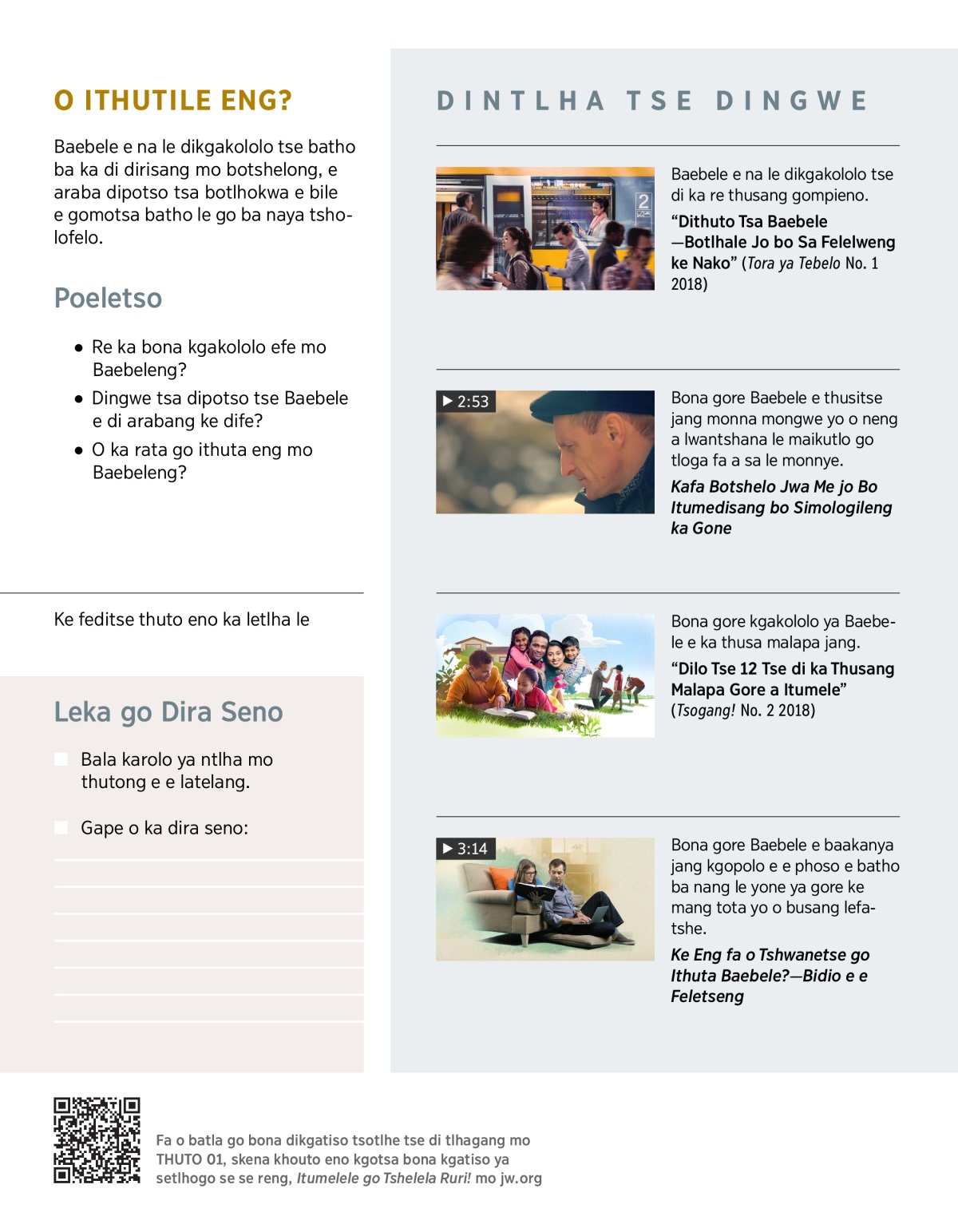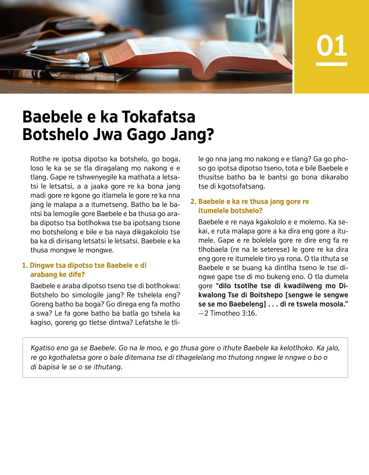 Rotlhe re ipotsa dipotso ka botshelo, go boga, loso le ka se se tla diragalang mo nakong e e tlang. Gape re tshwenyegile ka mathata a letsatsi le letsatsi, a a jaaka gore re ka bona jang madi gore re kgone go itlamela le gore re ka nna jang le malapa a a itumetseng. Batho ba le bantsi ba lemogile gore Baebele e ba thusa go araba dipotso tsa botlhokwa tse ba ipotsang tsone mo botshelong e bile e ba naya dikgakololo tse ba ka di dirisang letsatsi le letsatsi. Baebele e ka thusa mongwe le mongwe.