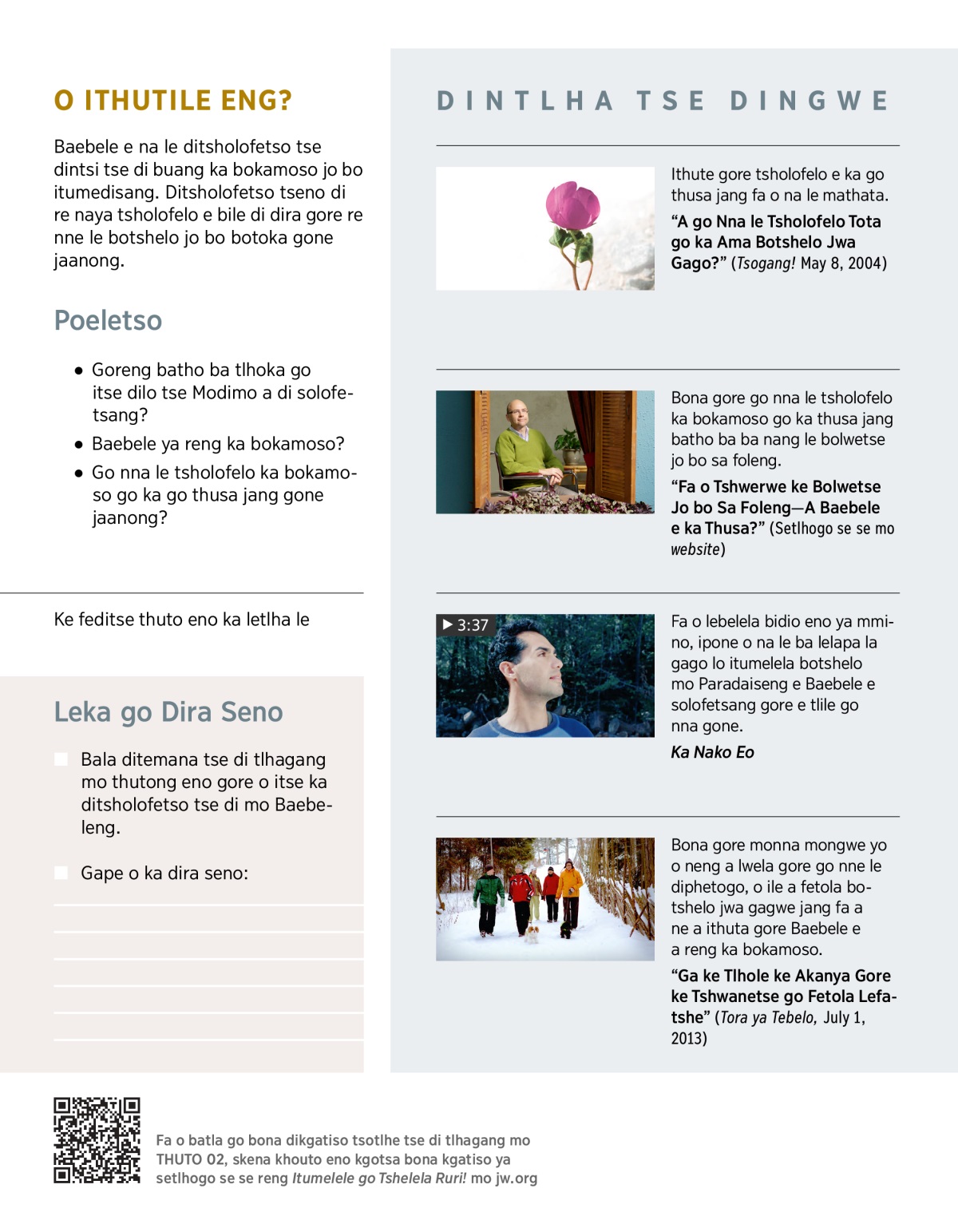Batho ba le bantsi ba na le mathata a a dirang gore ba hutsafale, ba tshwenyege ba bo ba utlwe botlhoko. A o kile wa diragalelwa ke sengwe se se neng sa dira gore o ikutlwe jalo? Gongwe o a boga ka gonne o a lwala (kgotsa o a bobola) kgotsa motho yo o mo ratang o tlhokafetse. Gongwe o ipotsa gore ‘A dilo di tla tsamaya di tokafala mo botshelong?’ Baebele e na le karabo e e kgotsofatsang ya potso eo.