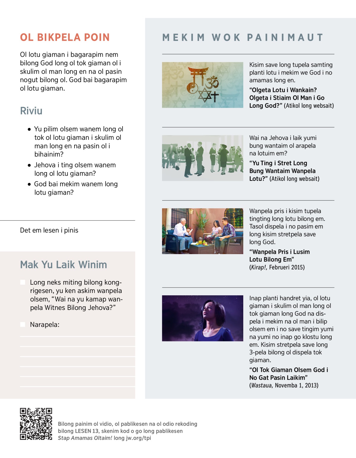 “Olgeta Lotu i Wankain? Olgeta i Stiaim Ol Man i Go Long God?” (Atikol long websait)