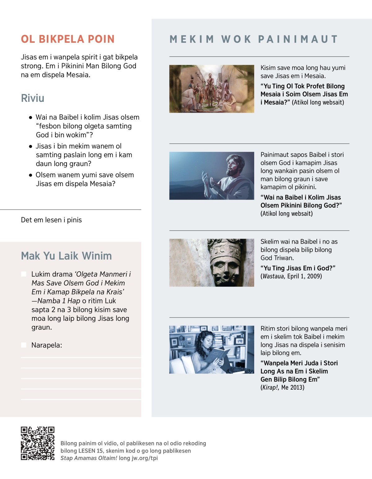 a Lesen 26 na 27 bai stori long wai na i mas i gat man bilong kisim bek ol manmeri, na olsem wanem Jisas i kisim bek yumi.