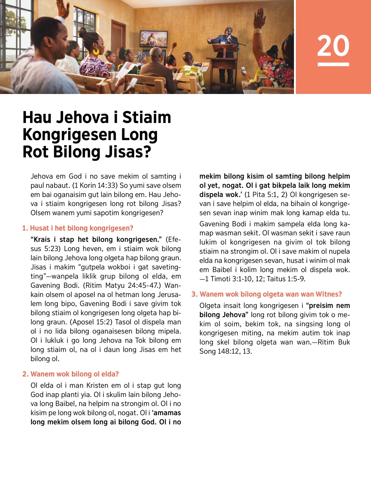 Jehova em God i no save mekim ol samting i paul nabaut. (1 Korin 14:33) So yumi save olsem em bai oganaisim gut lain bilong em. Hau Jehova i stiaim kongrigesen long rot bilong Jisas? Olsem wanem yumi sapotim kongrigesen?