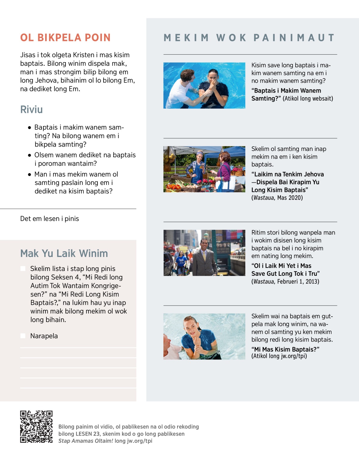 “Laikim na Tenkim Jehova—Dispela Bai Kirapim Yu Long Kisim Baptais” (Wastaua, Mas 2020)