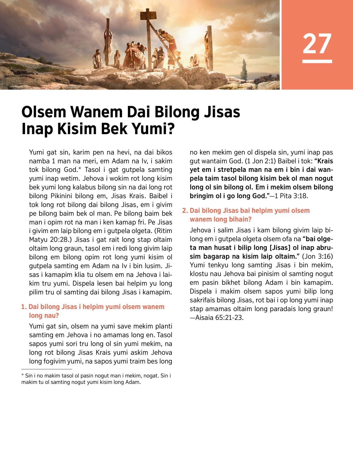 Yumi gat sin, karim pen na hevi, na dai bikos namba 1 man na meri, em Adam na Iv, i sakim tok bilong God.a Tasol i gat gutpela samting yumi inap wetim. Jehova i wokim rot long kisim bek yumi long kalabus bilong sin na dai long rot bilong Pikinini bilong em, Jisas Krais. Baibel i tok long rot bilong dai bilong Jisas, em i givim pe bilong baim bek ol man. Pe bilong baim bek man i opim rot na man i ken kamap fri. Pe Jisas i givim em laip bilong em i gutpela olgeta. (Ritim Matyu 20:28.) Jisas i gat rait long stap oltaim oltaim long graun, tasol em i redi long givim laip bilong em bilong opim rot long yumi kisim ol gutpela samting em Adam na Iv i bin lusim. Jisas i kamapim klia tu olsem em na Jehova i laikim tru yumi. Dispela lesen bai helpim yu long pilim tru ol samting dai bilong Jisas i kamapim.