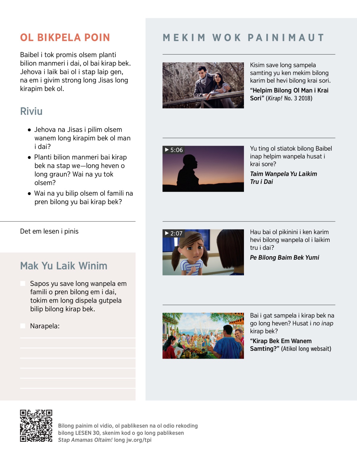Dai i save kamapim krai sore na bel hevi. Olsem na Baibel i kolim dai olsem birua. (1 Korin 15:26) Long Lesen 27, yu kisim save olsem Jehova bai daunim dispela birua. Tasol wanem samting bai painim ol man i dai pinis? Long dispela lesen, yu bai kisim save long narapela gutpela promis bilong Jehova—em bai givim bek laip long planti bilion manmeri na ol bai stap oltaim. Em bai kirapim bek ol! Yu ting dispela samting inap kamap tru? Ol bai kirap bek na stap long heven o long graun?
