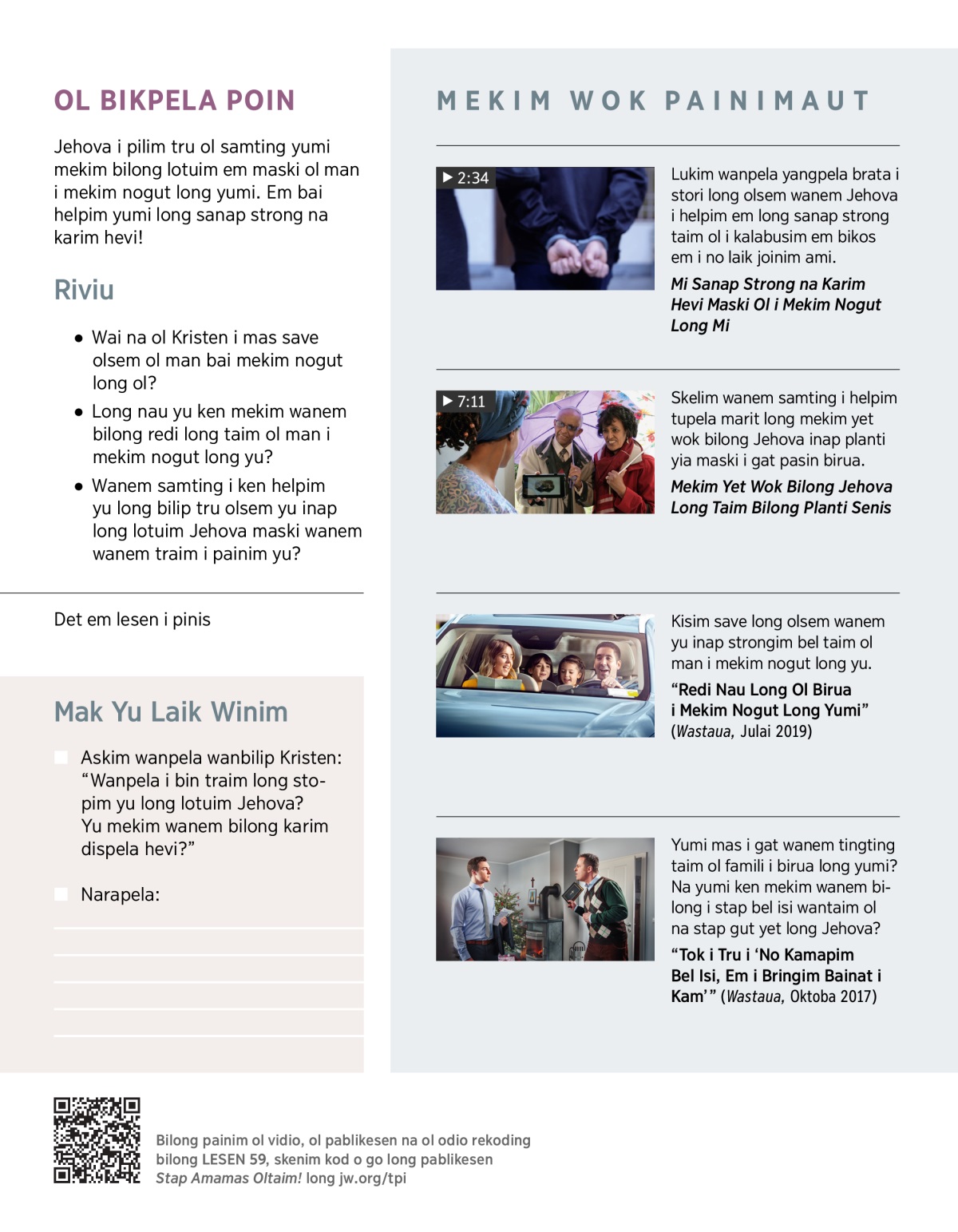 Ol Witnes Bilong Jehova ol i gat kain kain krismas na sindaun ol i stap gut long Jehova na wok yet long lotuim em maski ol man i mekim nogut long ol. Bilong lukim wanem samting i helpim ol, pilaim VIDIO. Na stori long dispela askim.
