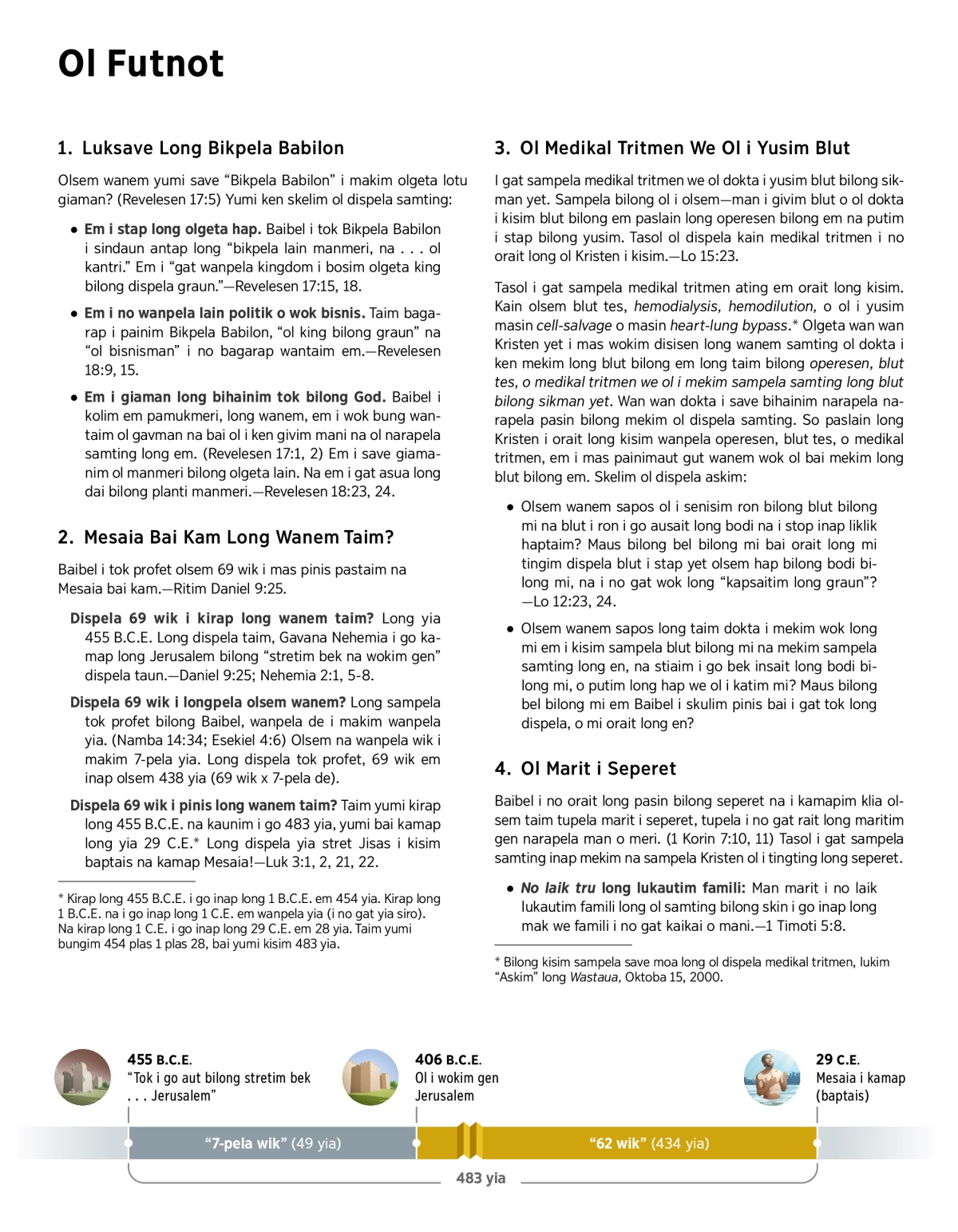 Dispela 69 wik i pinis long wanem taim? Taim yumi kirap long 455 B.C.E. na kaunim i go 483 yia, yumi bai kamap long yia 29 C.E.a Long dispela yia stret Jisas i kisim baptais na kamap Mesaia!—Luk 3:1, 2, 21, 22.