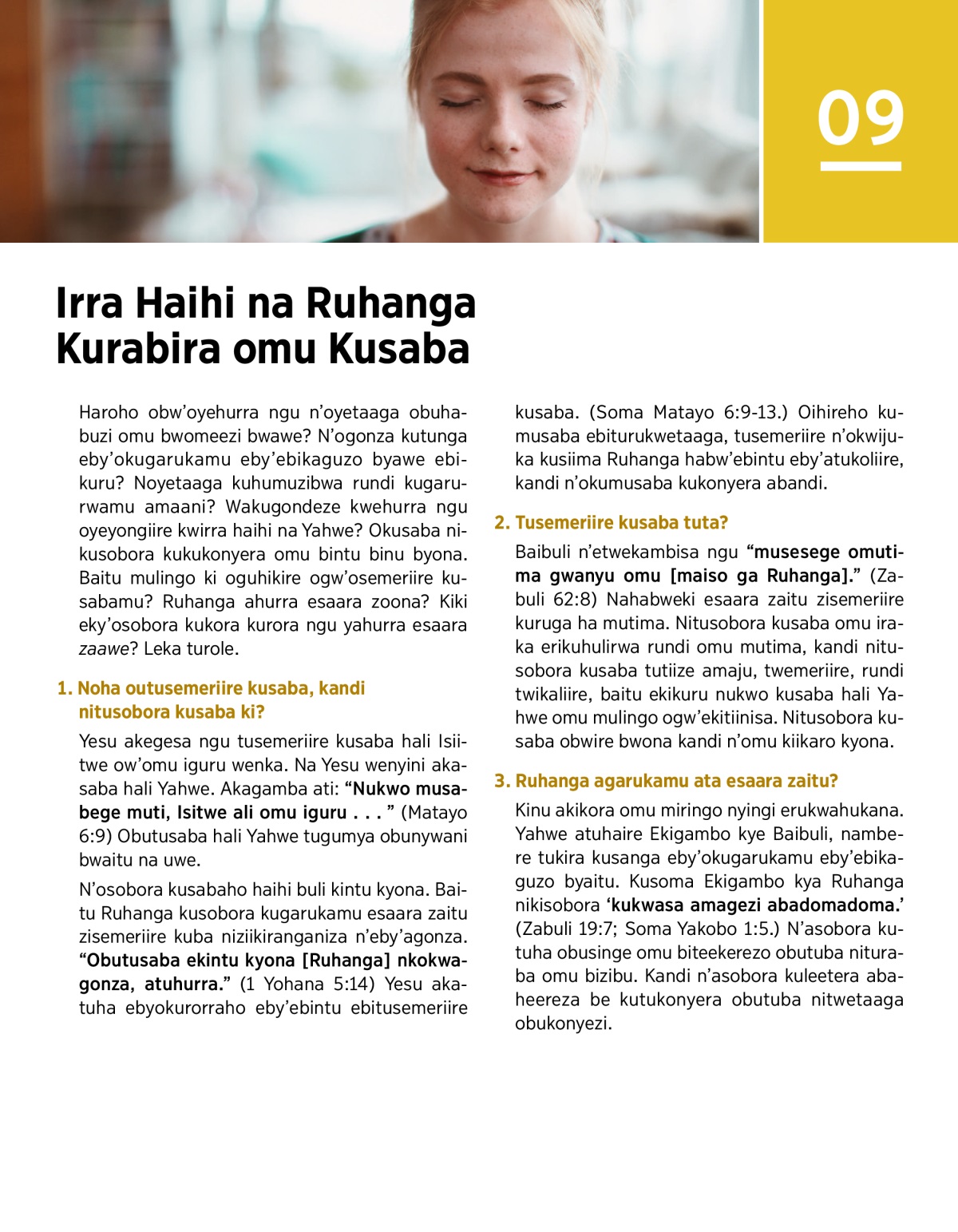 Haroho obw’oyehurra ngu n’oyetaaga obuhabuzi omu bwomeezi bwawe? N’ogonza kutunga eby’okugarukamu eby’ebikaguzo byawe ebikuru? Noyetaaga kuhumuzibwa rundi kugarurwamu amaani? Wakugondeze kwehurra ngu oyeyongiire kwirra haihi na Yahwe? Okusaba nikusobora kukukonyera omu bintu binu byona. Baitu mulingo ki oguhikire ogw’osemeriire kusabamu? Ruhanga ahurra esaara zoona? Kiki eky’osobora kukora kurora ngu yahurra esaara zaawe? Leka turole.