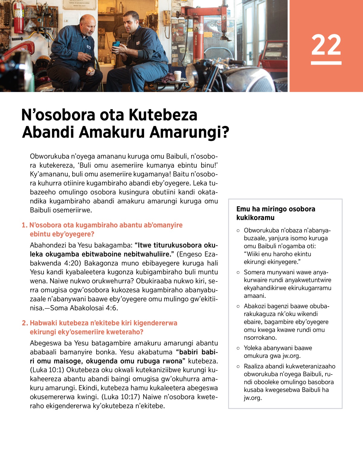 Obworukuba n’oyega amananu kuruga omu Baibuli, n’osobora kutekereza, ‘Buli omu asemeriire kumanya ebintu binu!’ Ky’amananu, buli omu asemeriire kugamanya! Baitu n’osobora kuhurra otiinire kugambiraho abandi eby’oyegere. Leka tubazeeho omulingo osobora kusingura obutiini kandi okatandika kugambiraho abandi amakuru amarungi kuruga omu Baibuli osemeriirwe.