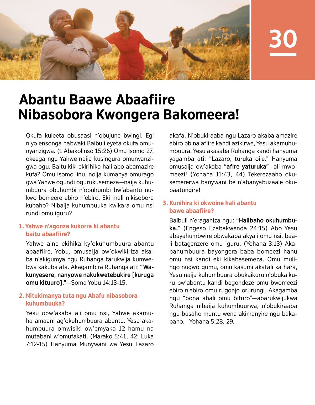Okufa kuleeta obusaasi n’obujune bwingi. Egi niyo ensonga habwaki Baibuli eyeta okufa omunyanzigwa. (1 Abakolinso 15:26) Omu isomo 27, okeega ngu Yahwe naija kusingura omunyanzigwa ogu. Baitu kiki ekirihika hali abo abamazire kufa? Omu isomo linu, noija kumanya omurago gwa Yahwe ogundi ogurukusemeza—naija kuhumbuura obuhumbi n’obuhumbi bw’abantu nukwo bomeere ebiro n’ebiro. Eki mali nikisobora kubaho? Nibaija kuhumbuuka kwikara omu nsi rundi omu iguru?