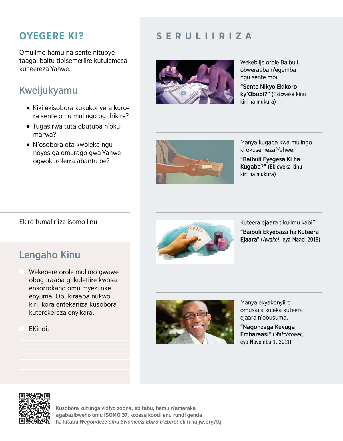 Yahwe ali Ruhanga omugabi, kandi tuhondera ekyokurorraho kye obutwikara twetekaniize “kugaba.” (1 Timoseo 6:18) Nitusobora kukozesa kurungi sente kurabira omu kusagika ekitebe hamu n’okukonyera abali omu bwetaago kukira muno ab’oruganda na banyaanya itwe. Yahwe tarora obwingi bwa sente tuhaireyo, baitu arora ekigendererwa kyaitu. Obuturagaba twihire ha mutima, nitwija kutunga okusemererwa kandi tusemeze Yahwe.—Soma Engeso Ezabakwenda 20:35.