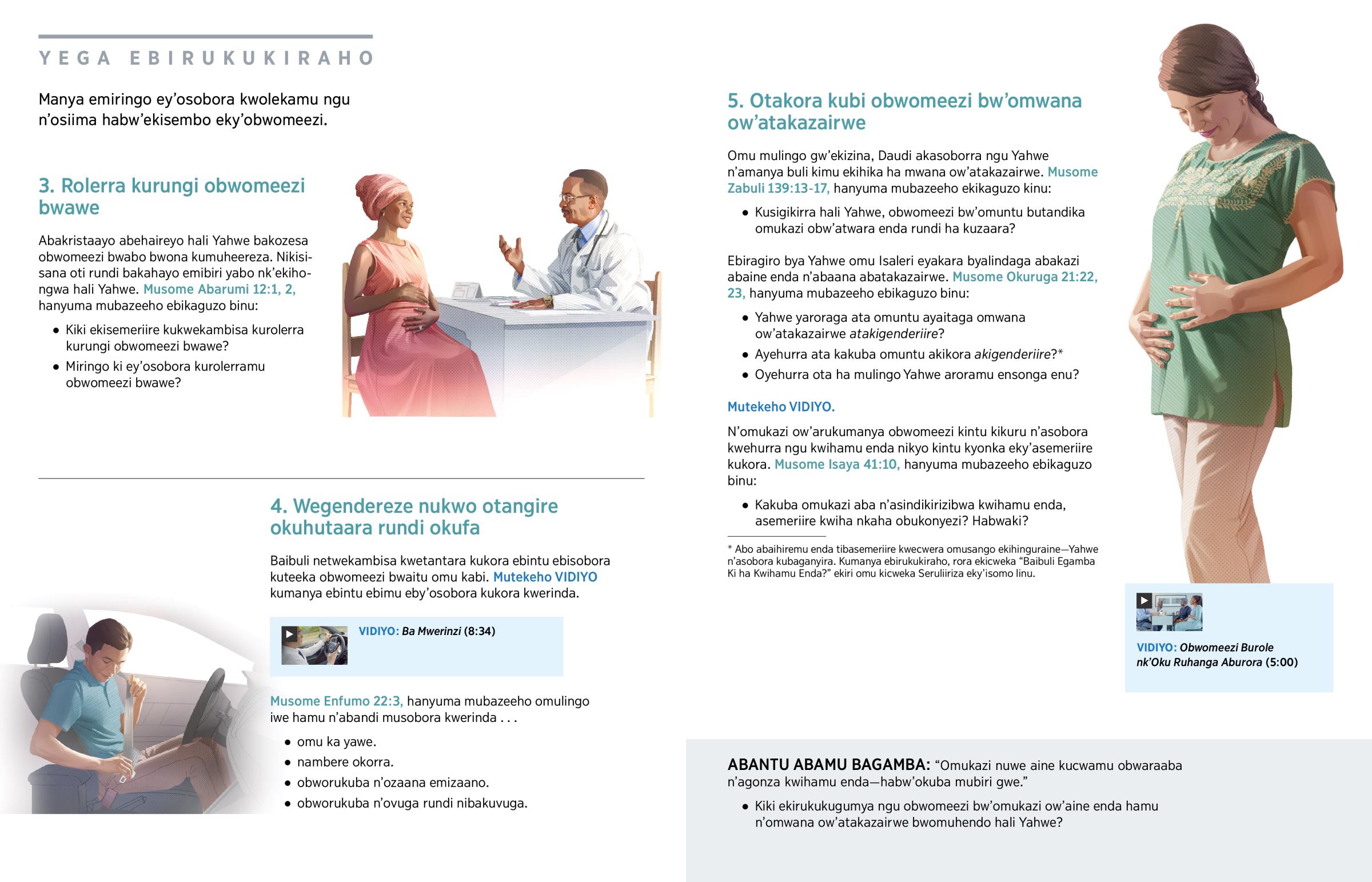 Kuruga akasumi maama waawe obuyatwaire enda, Yahwe akatandika kukufaaho. Omu ha baheereza ba Ruhanga arukwetwa Daudi akaterekerezebwa omwoyo ogurukwera yagamba ati: “Amaiso gawe gakarora omubiri gwange gutakahikiriire.” (Zabuli 139:16) Obwomeezi bwawe bw’omuhendo hali Yahwe. (Soma Matayo 10:29-31.) Kimusaasa muno omuntu obw’acwamu kweyita.a (Okuruga 20:13) Kandi kisaaliza Yahwe obutunagiriza obwomeezi bwaitu tukabuteeka omu kabi rundi obututafaayo kulinda obwomeezi obw’abandi. Obutulinda obwomeezi bwaitu hamu n’obw’abandi, twoleka ngu nitusiima habw’ekisembo kinu ekirungi.