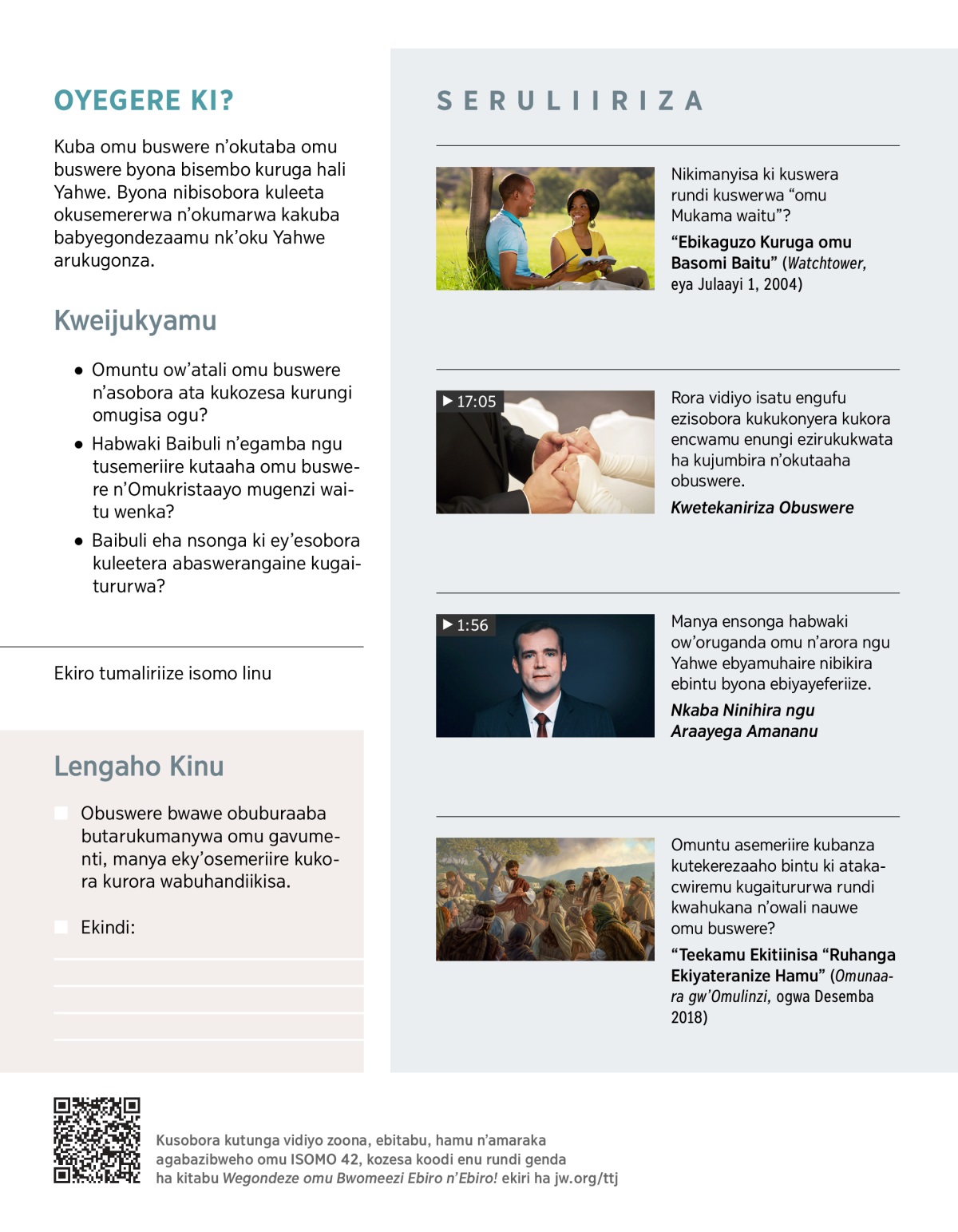 Abakristaayo abatali omu buswere nibasobora kwegondeza omu kutaba omu buswere nka Yesu. Mutekeho VIDIYO, hanyuma mubazeeho ekikaguzo ekirukuhonderaho.