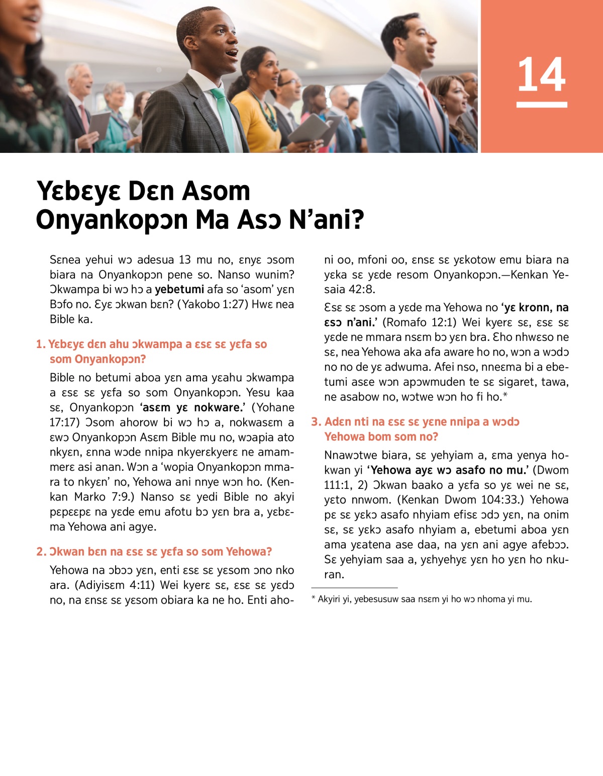 Sɛnea yehui wɔ adesua 13 mu no, ɛnyɛ ɔsom biara na Onyankopɔn pene so. Nanso wunim? Ɔkwampa bi wɔ hɔ a yebetumi afa so ‘asom’ yɛn Bɔfo no. Ɛyɛ ɔkwan bɛn? (Yakobo 1:27) Hwɛ nea Bible ka.