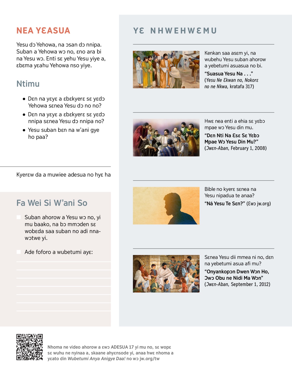 Bere a Yesu baa asaase so no, nsɛm a ɔkae ne nneɛma a ɔyɛe no, sɛ yesua ho ade a, ɛbɛma yɛahu sɛ ɔwɔ suban pa pii. Afei, ɛbɛma yɛn ani abegye ho sɛ yɛbɛfa ɔne n’Agya Yehowa adamfo. Ne suban ahorow a ɛyɛ fɛ no, ebi ne dɛn? Afei nso, yɛbɛyɛ dɛn asuasua sɛnea Yesu bɔɔ ne bra no?