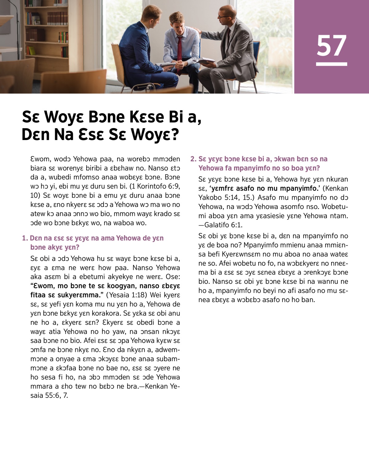Sɛ obi yɛ bɔne kɛse bi a, dɛn na mpanyimfo no yɛ de boa no? Mpanyimfo mmienu anaa mmiɛnsa befi Kyerɛwnsɛm no mu aboa no anaa wateɛ ne so. Afei wobetu no fo, na wɔbɛkyerɛ no nneɛma bi a ɛsɛ sɛ ɔyɛ sɛnea ɛbɛyɛ a ɔrenkɔyɛ bɔne bio. Nanso sɛ obi yɛ bɔne kɛse bi na wannu ne ho a, mpanyimfo no beyi no afi asafo no mu sɛnea ɛbɛyɛ a wɔbɛbɔ asafo no ho ban.