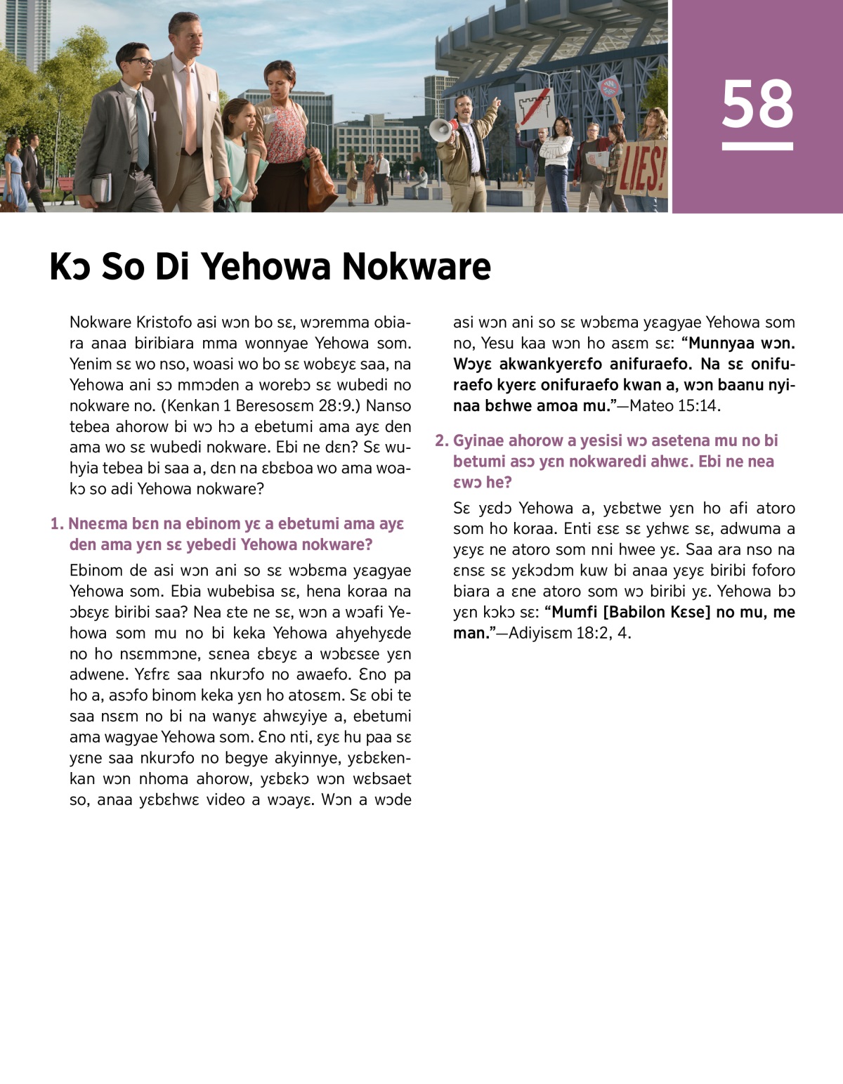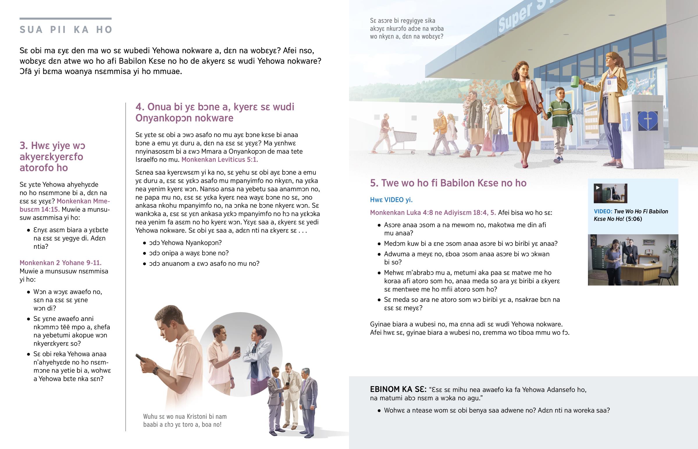 Sɛ obi ma ɛyɛ den ma wo sɛ wubedi Yehowa nokware a, dɛn na wobɛyɛ? Afei nso, wobɛyɛ dɛn atwe wo ho afi Babilon Kɛse no ho de akyerɛ sɛ wudi Yehowa nokware? Ɔfã yi bɛma woanya nsɛmmisa yi ho mmuae.