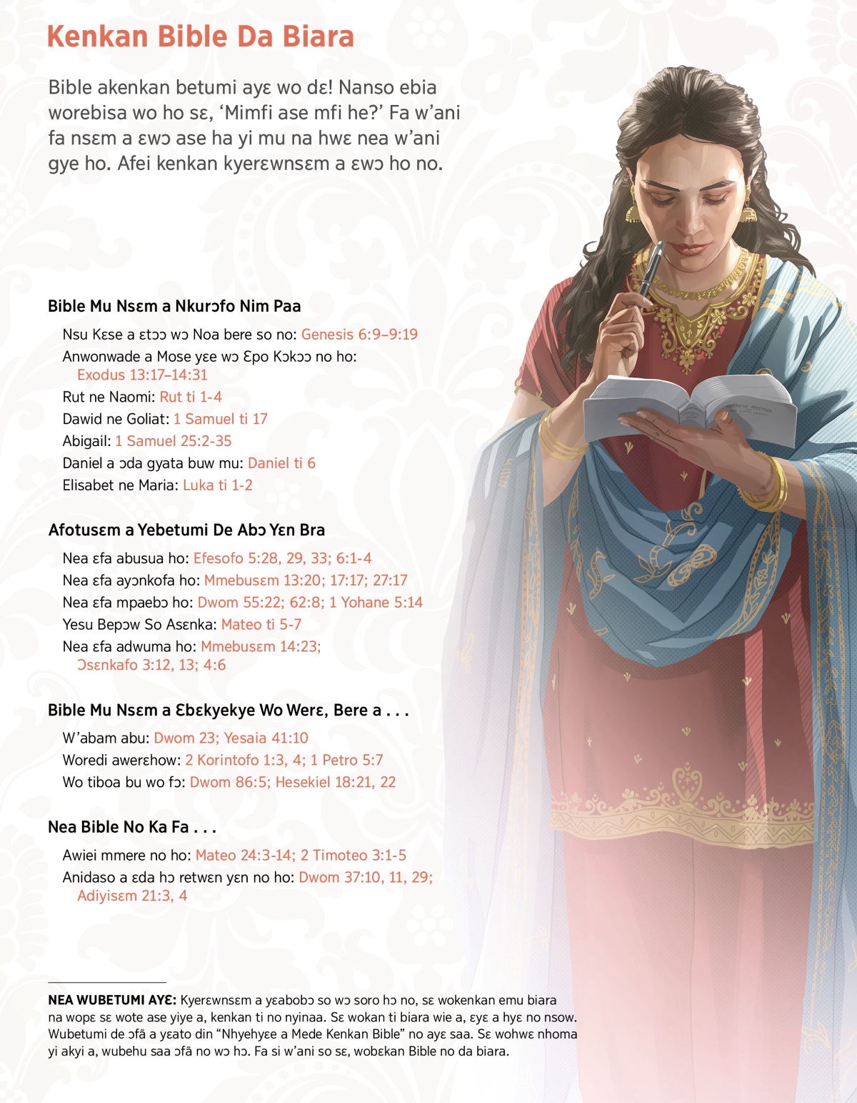 NEA WUBETUMI AYƐ: Kyerɛwnsɛm a yɛabobɔ so wɔ soro hɔ no, sɛ wokenkan emu biara na wopɛ sɛ wote ase yiye a, kenkan ti no nyinaa. Sɛ wokan ti biara wie a, ɛyɛ a hyɛ no nsow. Wubetumi de ɔfã a yɛato din “Nhyehyɛe a Mede Kenkan Bible” no ayɛ saa. Sɛ wohwɛ nhoma yi akyi a, wubehu saa ɔfã no wɔ hɔ. Fa si w’ani so sɛ, wobɛkan Bible no da biara.