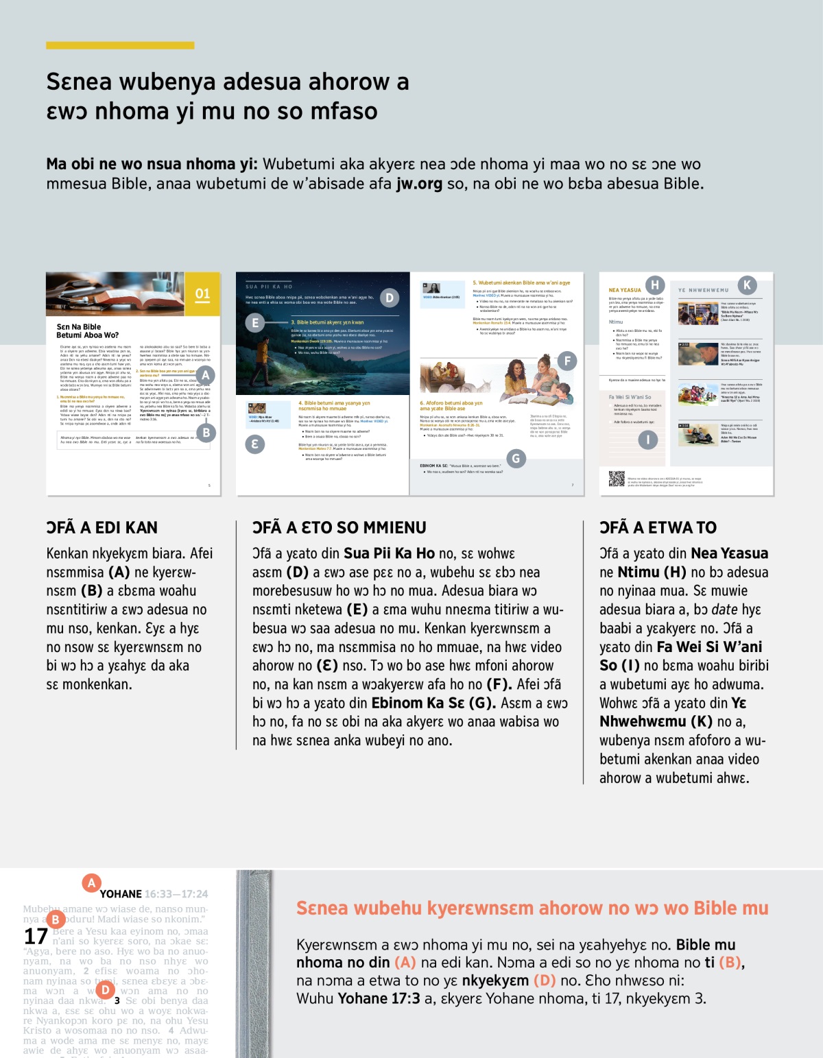 Kyerɛwnsɛm a ɛwɔ nhoma yi mu no, sei na yɛahyehyɛ no. Bible mu nhoma no din (A) na edi kan. Nɔma a edi so no yɛ nhoma no ti (B), na nɔma a etwa to no yɛ nkyekyɛm (D) no. Ɛho nhwɛso ni: Wuhu Yohane 17:3 a, ɛkyerɛ Yohane nhoma, ti 17, nkyekyɛm 3.