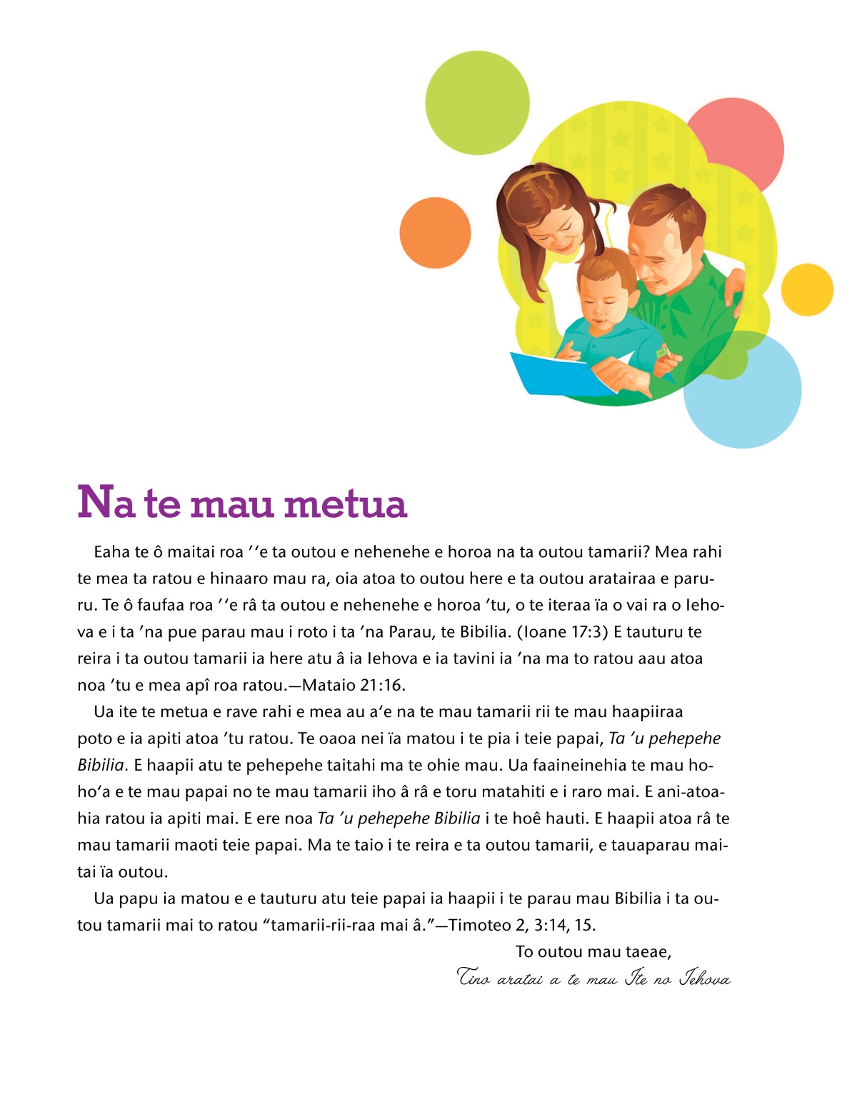 Ua papu ia matou e e tauturu atu teie papai ia haapii i te parau mau Bibilia i ta outou tamarii mai to ratou “tamarii-rii-raa mai â.”—Timoteo 2, 3:14, 15.
