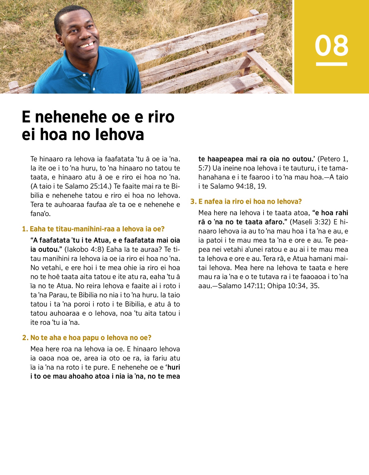 Te hinaaro ra Iehova ia faafatata ˈtu â oe ia ˈna. Ia ite oe i to ˈna huru, to ˈna hinaaro no tatou te taata, e hinaaro atu â oe e riro ei hoa no ˈna. (A taio i te Salamo 25:14.) Te faaite mai ra te Bibilia e nehenehe tatou e riro ei hoa no Iehova. Tera te auhoaraa faufaa aˈe ta oe e nehenehe e fanaˈo.