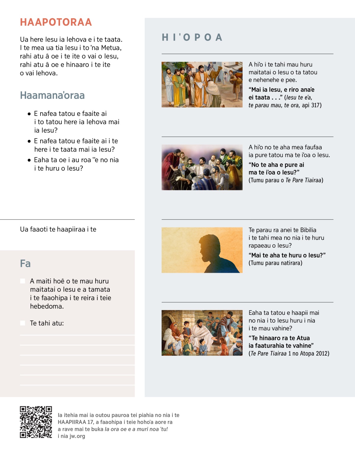 Ia haapii tatou i ta Iesu i parau e i rave i te fenua nei, e ite tatou i to ˈna mau huru maitatai a hinaaro atu ai tatou e riro ei hoa no Iesu e no to ˈna Metua ra, Iehova. Eaha te tahi o teie mau huru maitatai? E e nafea ia pee i te hiˈoraa o Iesu i roto i to tatou oraraa?