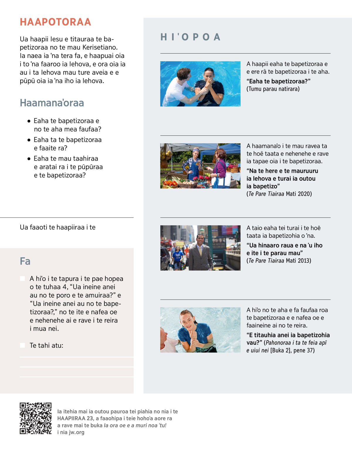 “Na te here e te mauruuru ia Iehova e turai ia outou ia bapetizo” (Te Pare Tiairaa Mati 2020)