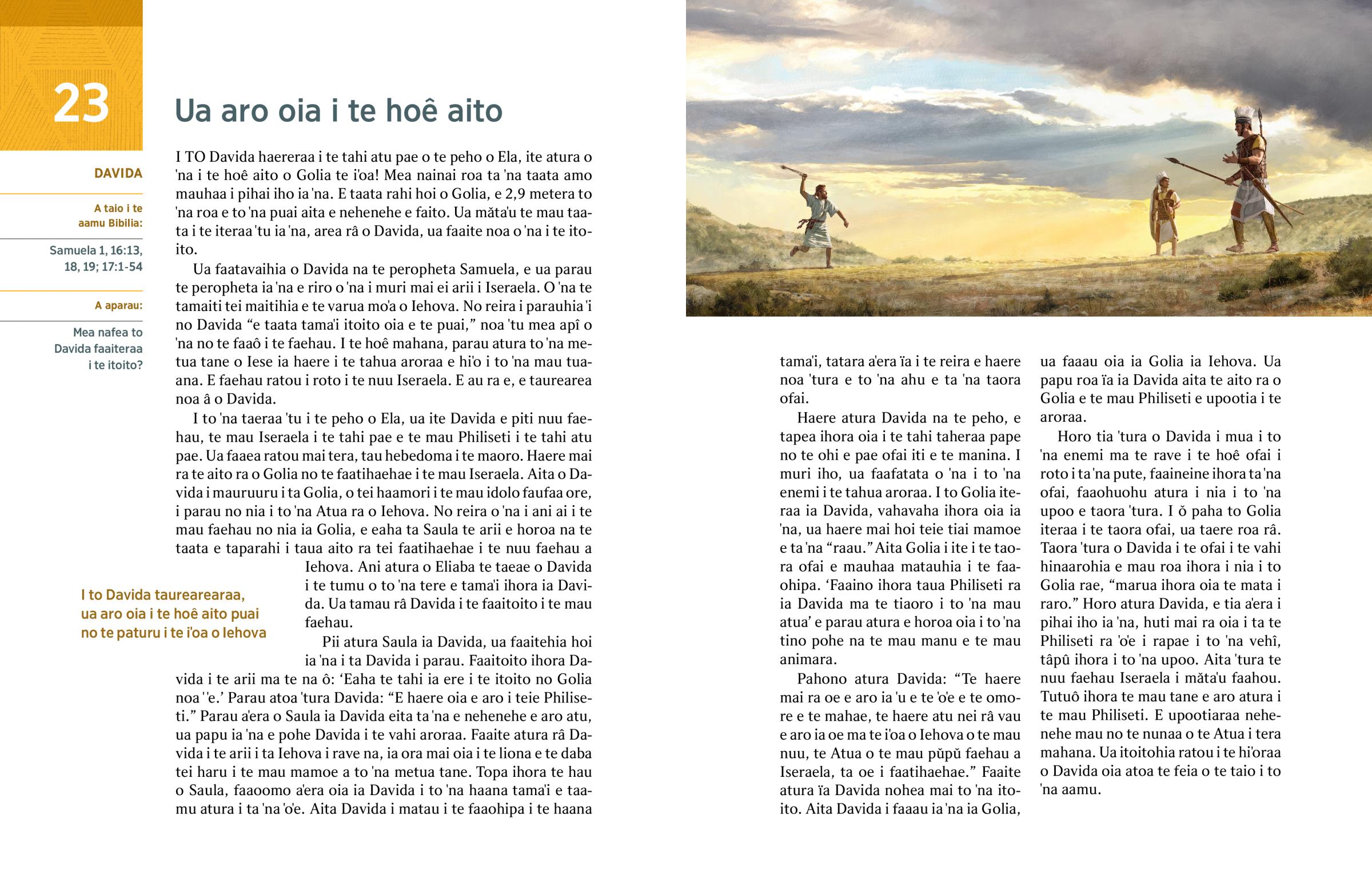 I TO Davida haereraa i te tahi atu pae o te peho o Ela, ite atura o ˈna i te hoê aito o Golia te iˈoa! Mea nainai roa ta ˈna taata amo mauhaa i pihai iho ia ˈna. E taata rahi hoi o Golia, e 2,9 metera to ˈna roa e to ˈna puai aita e nehenehe e faito. Ua mǎtaˈu te mau taata i te iteraa ˈtu ia ˈna, area râ o Davida, ua faaite noa o ˈna i te itoito.