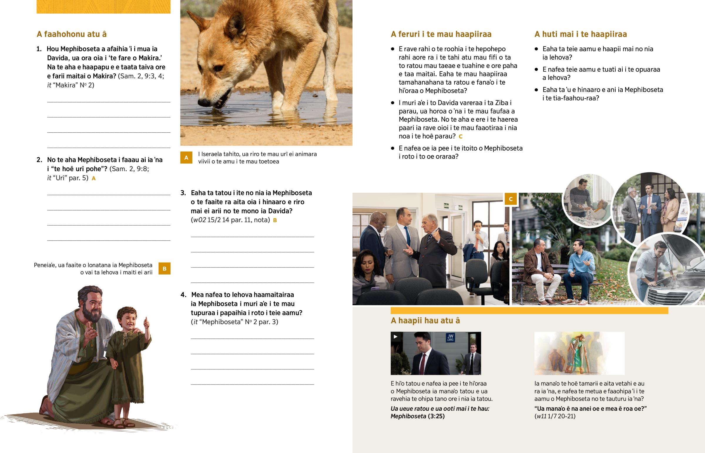2. No te aha Mephiboseta i faaau ai ia ˈna i “te hoê urî pohe”? (Sam. 2, 9:8; it “Urî” par. 5) A