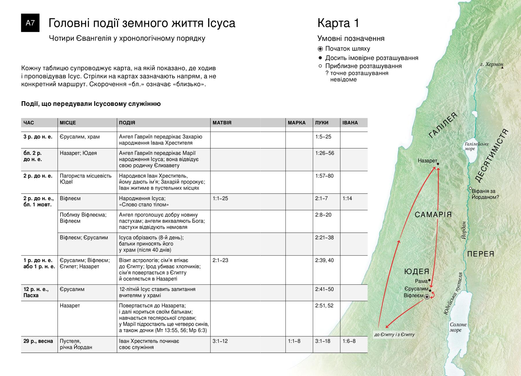 Кожну таблицю супроводжує карта, на якій показано, де ходив і проповідував Ісус. Стрілки на картах зазначають напрям, а не конкретний маршрут. Скорочення «бл.» означає «близько».