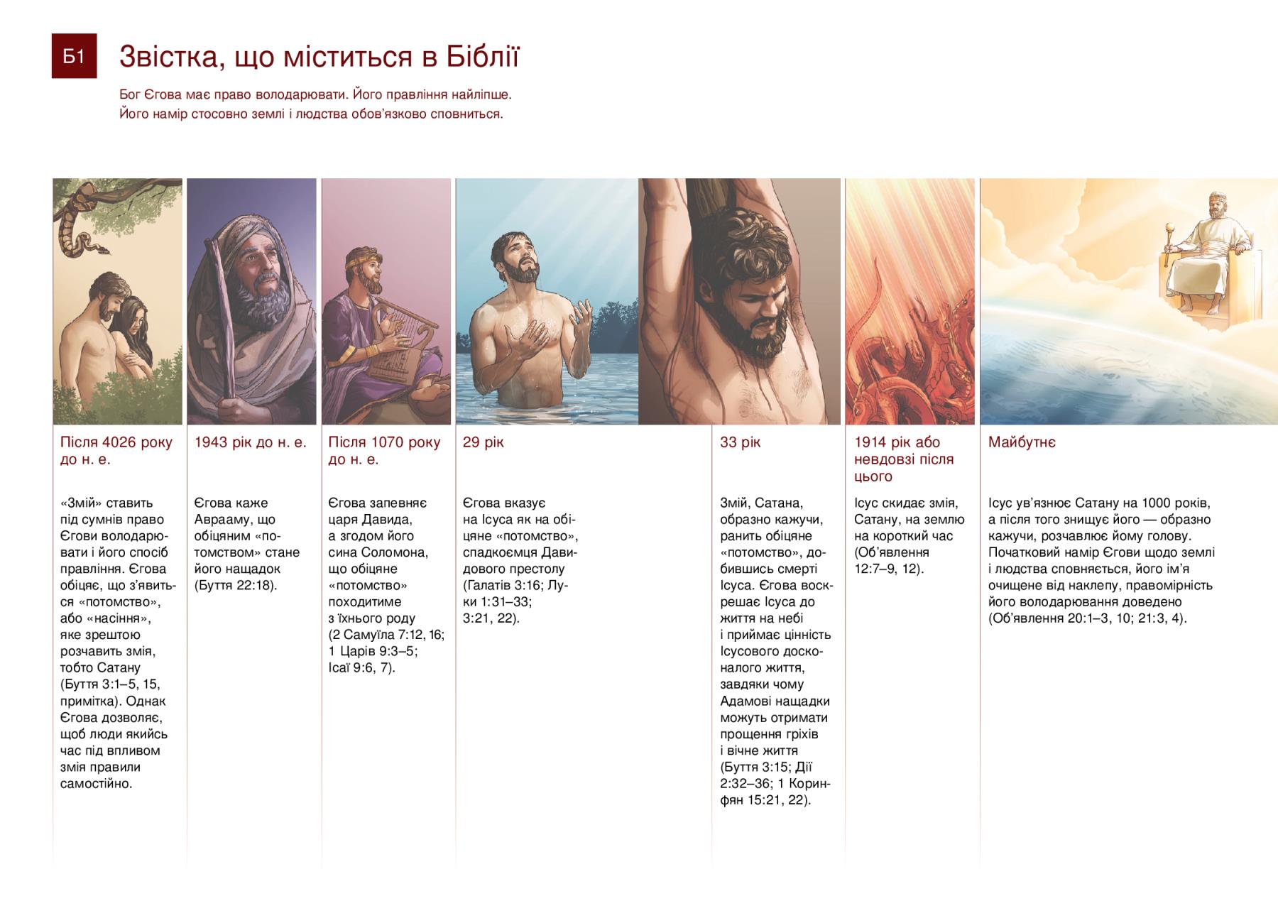 Після 4026 року до н. е. «Змій» ставить під сумнів право Єгови володарювати і його спосіб правління. Єгова обіцяє, що з’явиться «потомство», або «насіння», яке зрештою розчавить змія, тобто Сатану (Буття 3:1–5, 15, примітка). Однак Єгова дозволяє, щоб люди якийсь час під впливом змія правили самостійно. |