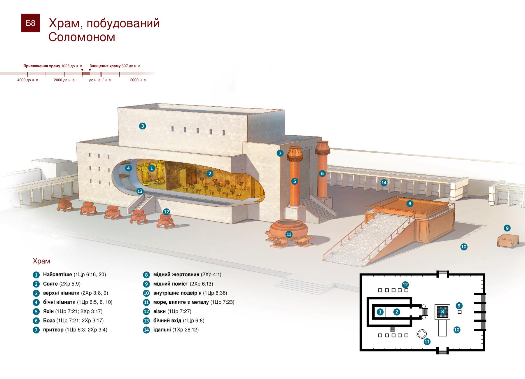 Б8 Храм, побудований Соломоном Друкована версія Храм 1 Найсвятіше (1Цр 6:16, 20) 2 Святе (2Хр 5:9) 3 верхні кімнати (2Хр 3:8, 9) 4 бічні кімнати (1Цр 6:5, 6, 10) 5 Яхін (1Цр 7:21; 2Хр 3:17) 6 Боаз (1Цр 7:21; 2Хр 3:17) 7 притвор (1Цр 6:3; 2Хр 3:4) 8 мідний жертовник (2Хр 4:1) 9 мідний поміст (2Хр 6:13) 10 внутрішнє подвір’я (1Цр 6:36) 11 море, вилите з металу (1Цр 7:23) 12 візки (1Цр 7:27) 13 бічний вхід (1Цр 6:8) 14 їдальні (1Хр 28:12)