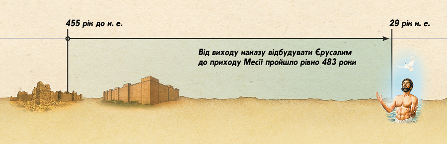 Однак ці символічні тижні складалися не з буквальних семи днів, а з років, тому в Біблії їх названо «роки-тижні» (Даниїла 9:24, 25)b. Месія мав прийти через 69 «років-тижнів»,— кожен з яких тривав по сім років,— тобто через 483 роки. Даниїлове пророцтво сповнилося в 29 році н. е., коли Ісус охрестився. Саме тоді минуло рівно 483 роки від 455 року до н. е.