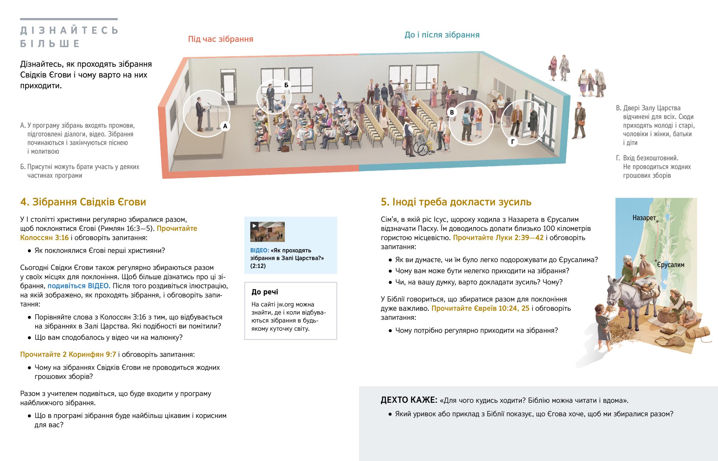 Сьогодні Свідки Єгови також регулярно збираються разом у своїх місцях для поклоніння. Щоб більше дізнатись про ці зібрання, подивіться ВІДЕО. Після того роздивіться ілюстрацію, на якій зображено, як проходять зібрання, і обговоріть запитання: