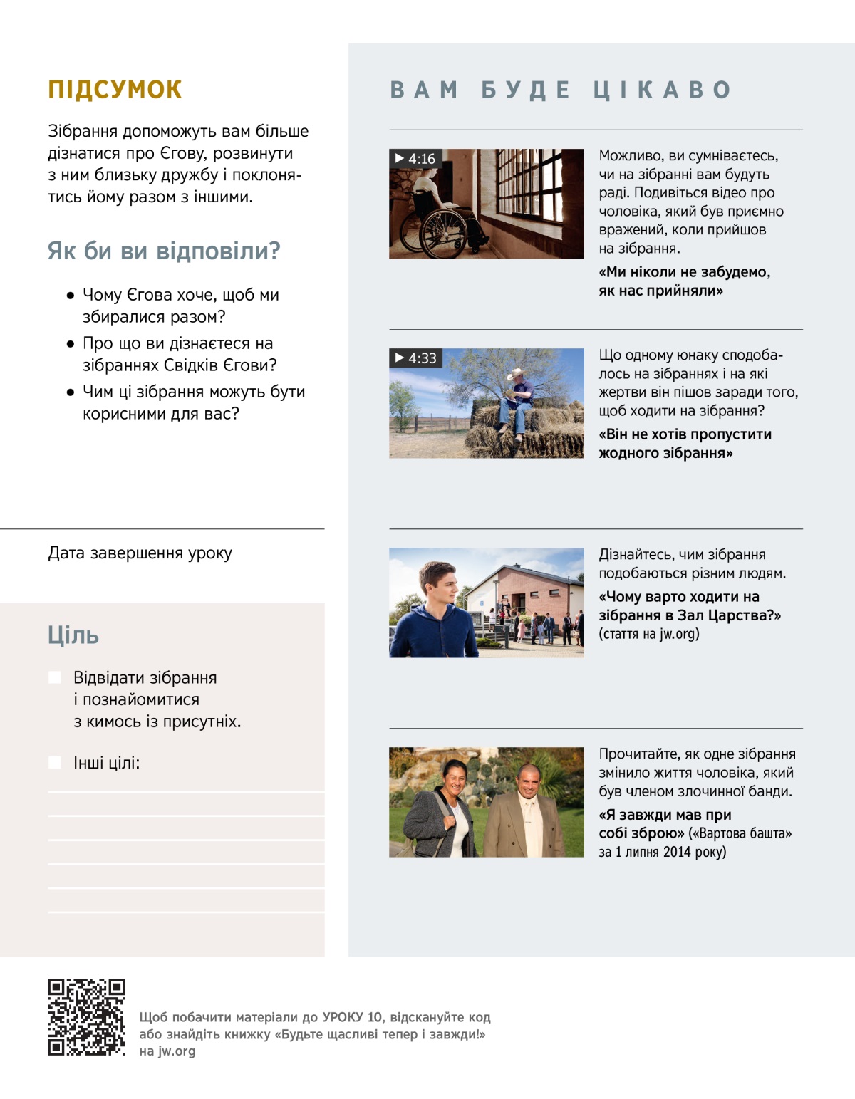 Чи вас уже запрошували на зібрання Свідків Єгови? Можливо, ви вагаєтесь, тому що не знаєте, що відбувається на цих зібраннях і чи справді варто на них приходити. Цей урок розповість, чим корисні зібрання, як вони допоможуть зблизитися з Богом і чому кожен може знайти на зібраннях щось цінне для себе.
