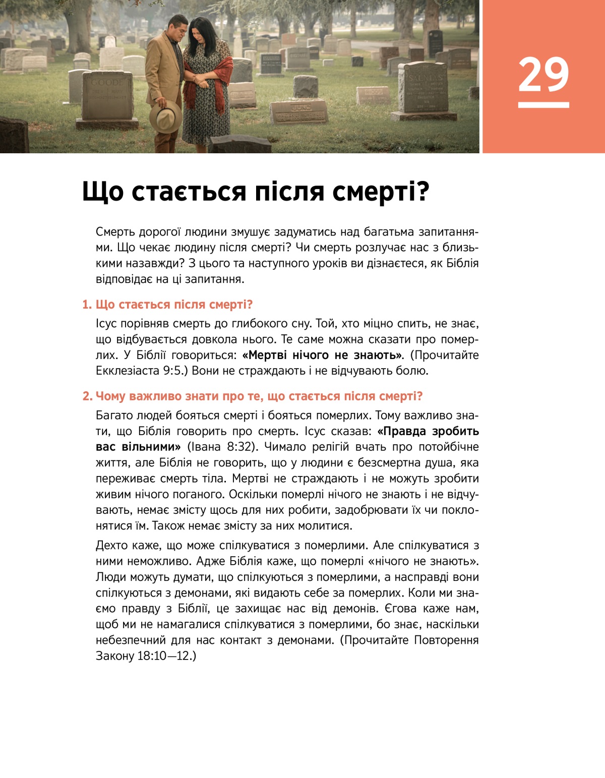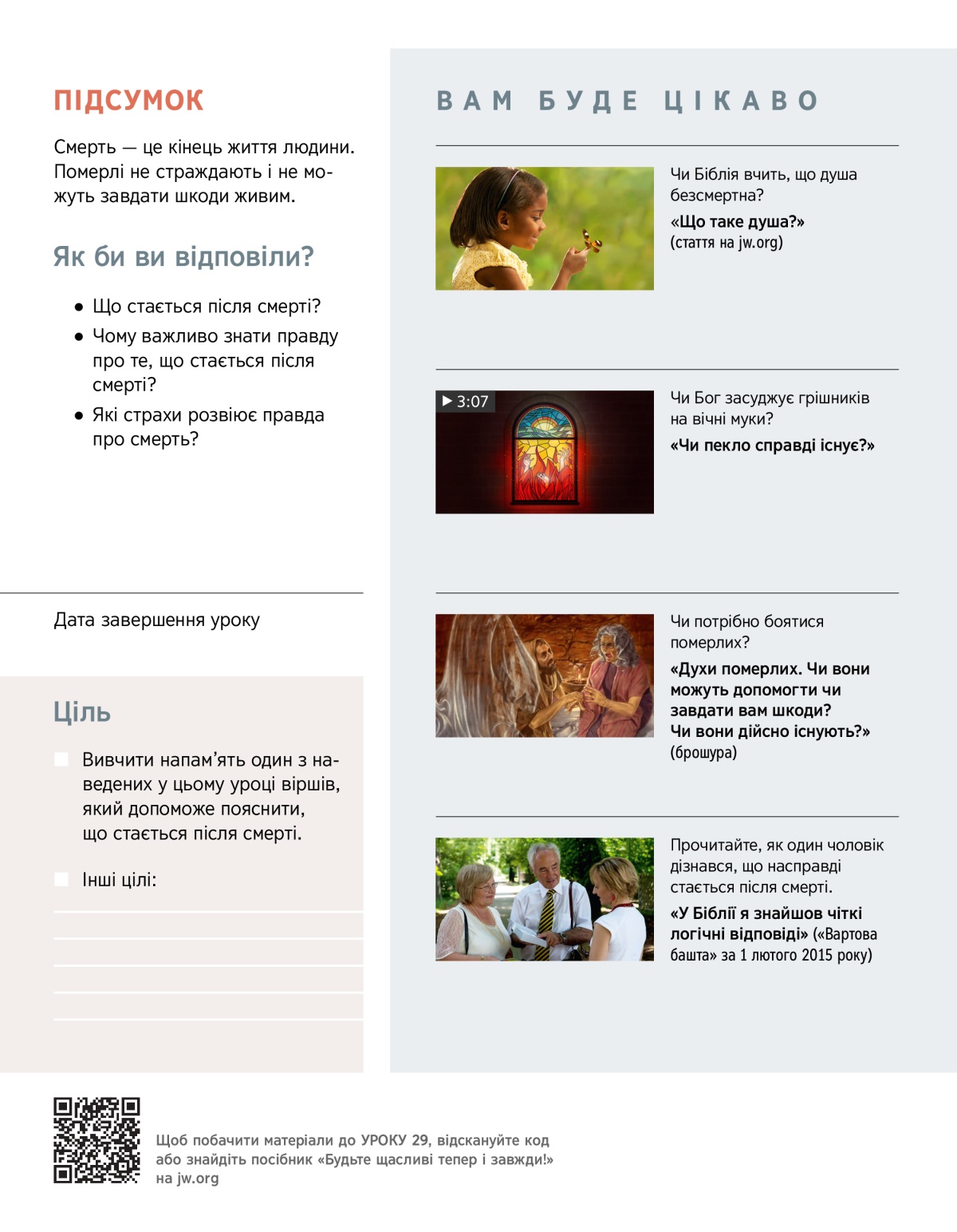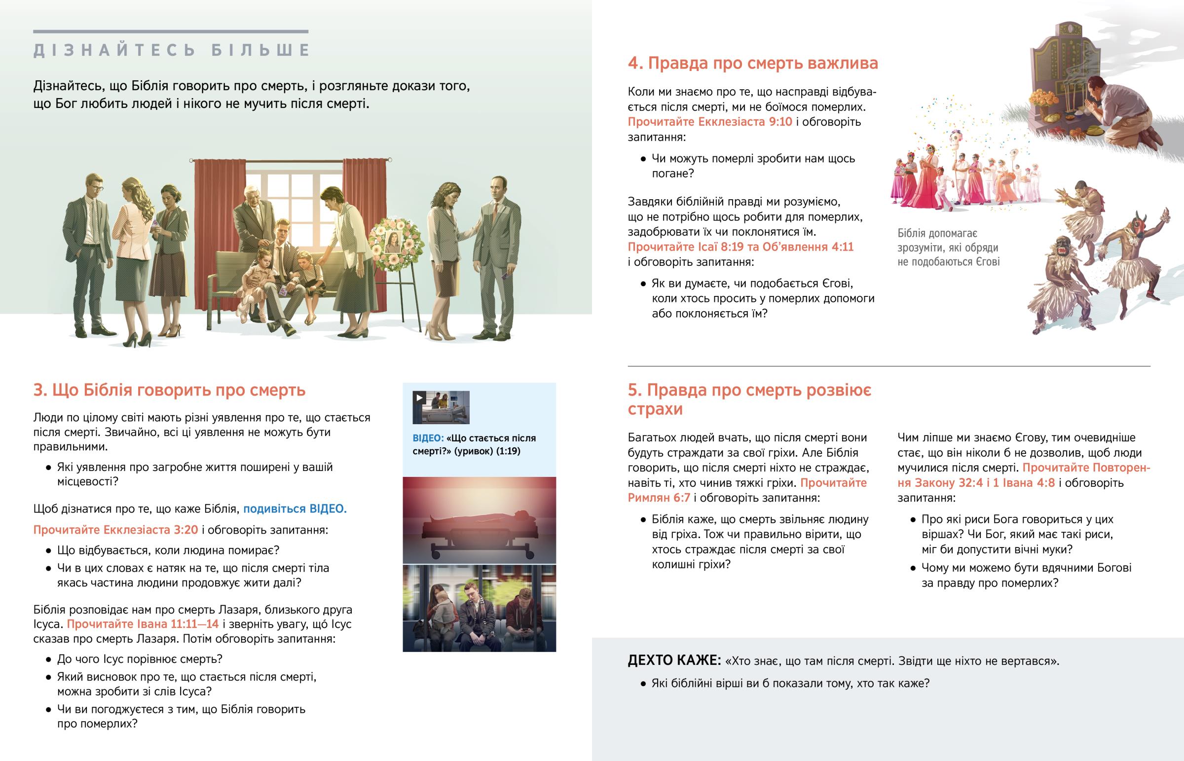 Смерть дорогої людини змушує задуматись над багатьма запитаннями. Що чекає людину після смерті? Чи смерть розлучає нас з близькими назавжди? З цього та наступного уроків ви дізнаєтеся, як Біблія відповідає на ці запитання.