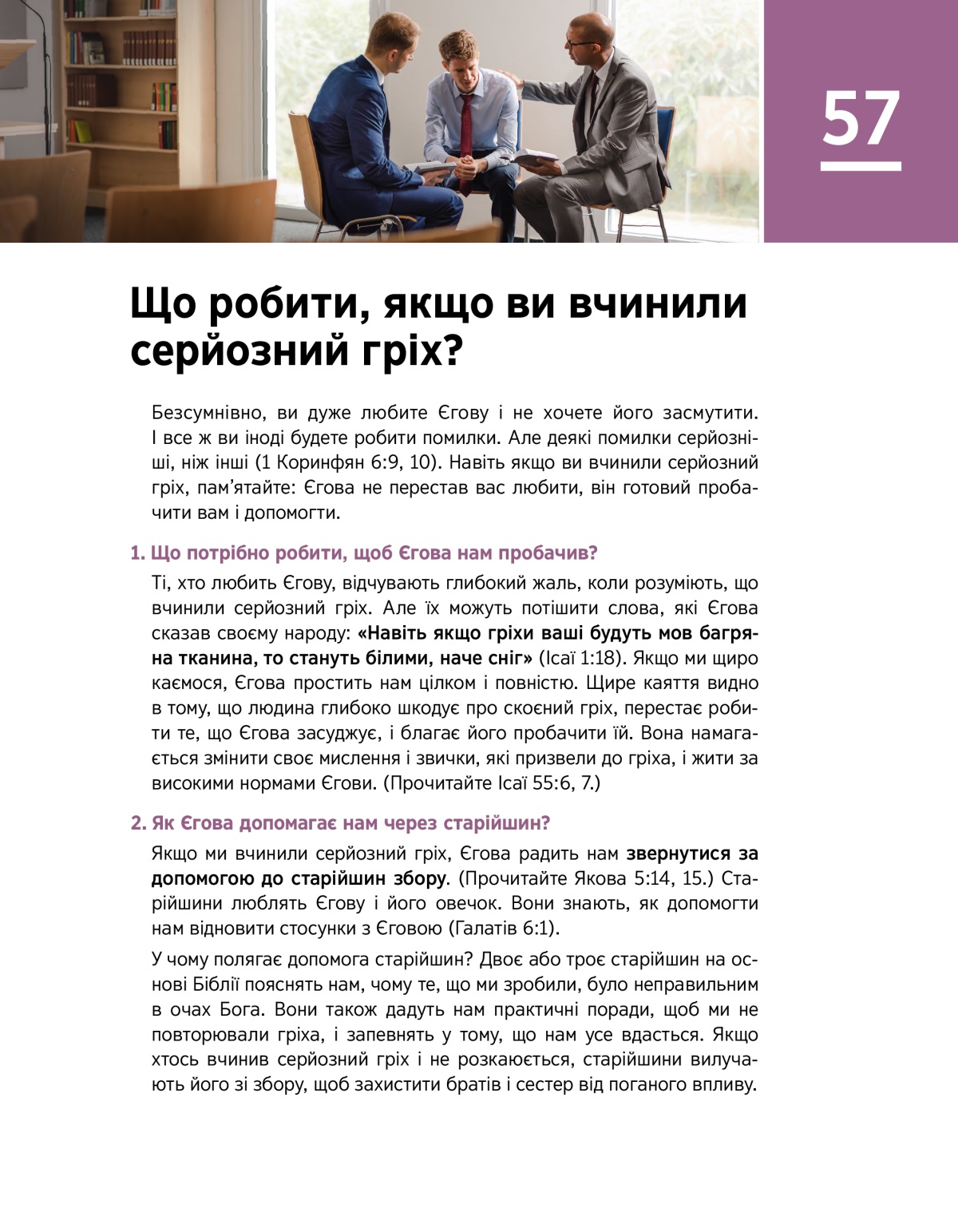 Якщо ми вчинили серйозний гріх, Єгова радить нам звернутися за допомогою до старійшин збору. (Прочитайте Якова 5:14, 15.) Старійшини люблять Єгову і його овечок. Вони знають, як допомогти нам відновити стосунки з Єговою (Галатів 6:1).