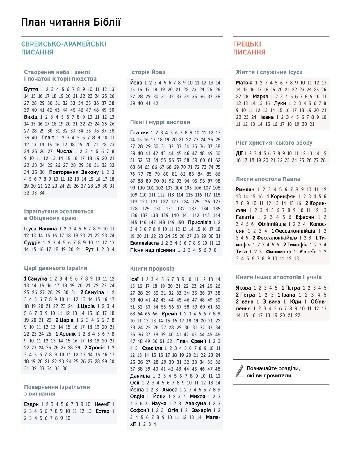 План читання Біблії Друкована версія Створення неба і землі і початок історії людства Ізраїльтяни оселяються в Обіцяному краю Царі давнього Ізраїля Повернення ізраїльтян з вигнання Історія Йова Пісні і мудрі вислови Книги пророків Життя і служіння Ісуса Ріст християнського збору Листи апостола Павла Книги інших апостолів і учнів Позначайте розділи, які ви прочитали. ЄВРЕЙСЬКО-АРАМЕЙСЬКІ ПИСАННЯ Створення неба і землі і початок історії людства Буття 1 2 3 4 5 6 7 8 9 10 11 12 13 14 15 16 17 18 19 20 21 22 23 24 25 26 27 28 29 30 31 32 33 34 35 36 37 38 39 40 41 42 43 44 45 46 47 48 49 50 Вихід 1 2 3 4 5 6 7 8 9 10 11 12 13 14 15 16 17 18 19 20 21 22 23 24 25 26 27 28 29 30 31 32 33 34 35 36 37 38 39 40 Левіт 1 2 3 4 5 6 7 8 9 10 11 12 13 14 15 16 17 18 19 20 21 22 23 24 25 26 27 Числа 1 2 3 4 5 6 7 8 9 10 11 12 13 14 15 16 17 18 19 20 21 22 23 24 25 26 27 28 29 30 31 32 33 34 35 36 Повторення Закону 1 2 3 4 5 6 7 8 9 10 11 12 13 14 15 16 17 18 19 20 21 22 23 24 25 26 27 28 29 30 31 32 33 34 Ізраїльтяни оселяються в Обіцяному краю Ісуса Навина 1 2 3 4 5 6 7 8 9 10 11 12 13 14 15 16 17 18 19 20 21 22 23 24 Суддів 1 2 3 4 5 6 7 8 9 10 11 12 13 14 15 16 17 18 19 20 21 Рут 1 2 3 4 Царі давнього Ізраїля 1 Самуїла 1 2 3 4 5 6 7 8 9 10 11 12 13 14 15 16 17 18 19 20 21 22 23 24 25 26 27 28 29 30 31 2 Самуїла 1 2 3 4 5 6 7 8 9 10 11 12 13 14 15 16 17 18 19 20 21 22 23 24 1 Царів 1 2 3 4 5 6 7 8 9 10 11 12 13 14 15 16 17 18 19 20 21 22 2 Царів 1 2 3 4 5 6 7 8 9 10 11 12 13 14 15 16 17 18 19 20 21 22 23 24 25 1 Хронік 1 2 3 4 5 6 7 8 9 10 11 12 13 14 15 16 17 18 19 20 21 22 23 24 25 26 27 28 29 2 Хронік 1 2 3 4 5 6 7 8 9 10 11 12 13 14 15 16 17 18 19 20 21 22 23 24 25 26 27 28 29 30 31 32 33 34 35 36 Повернення ізраїльтян з вигнання Ездри 1 2 3 4 5 6 7 8 9 10 Неемії 1 2 3 4 5 6 7 8 9 10 11 12 13 Естер 1 2 3 4 5 6 7 8 9 10 Історія Йова Йова 1 2 3 4 5 6 7 8 9 10 11 12 13 14 15 16 17 18 19 20 21 22 23 24 25 26 27 28 29 30 31 32 33 34 35 36 37 38 39 40 41 42 Пісні і мудрі вислови Псалми 1 2 3 4 5 6 7 8 9 10 11 12 13 14 15 16 17 18 19 20 21 22 23 24 25 26 27 28 29 30 31 32 33 34 35 36 37 38 39 40 41 42 43 44 45 46 47 48 49 50 51 52 53 54 55 56 57 58 59 60 61 62 63 64 65 66 67 68 69 70 71 72 73 74 75 76 77 78 79 80 81 82 83 84 85 86 87 88 89 90 91 92 93 94 95 96 97 98 99 100 101 102 103 104 105 106 107 108 109 110 111 112 113 114 115 116 117 118 119 120 121 122 123 124 125 126 127 128 129 130 131 132 133 134 135 136 137 138 139 140 141 142 143 144 145 146 147 148 149 150 Прислів’я 1 2 3 4 5 6 7 8 9 10 11 12 13 14 15 16 17 18 19 20 21 22 23 24 25 26 27 28 29 30 31 Екклезіаста 1 2 3 4 5 6 7 8 9 10 11 12 Пісня над піснями 1 2 3 4 5 6 7 8 Книги пророків Ісаї 1 2 3 4 5 6 7 8 9 10 11 12 13 14 15 16 17 18 19 20 21 22 23 24 25 26 27 28 29 30 31 32 33 34 35 36 37 38 39 40 41 42 43 44 45 46 47 48 49 50 51 52 53 54 55 56 57 58 59 60 61 62 63 64 65 66 Єремії 1 2 3 4 5 6 7 8 9 10 11 12 13 14 15 16 17 18 19 20 21 22 23 24 25 26 27 28 29 30 31 32 33 34 35 36 37 38 39 40 41 42 43 44 45 46 47 48 49 50 51 52 Плач Єремії 1 2 3 4 5 Єзекіїля 1 2 3 4 5 6 7 8 9 10 11 12 13 14 15 16 17 18 19 20 21 22 23 24 25 26 27 28 29 30 31 32 33 34 35 36 37 38 39 40 41 42 43 44 45 46 47 48 Даниїла 1 2 3 4 5 6 7 8 9 10 11 12 Осії 1 2 3 4 5 6 7 8 9 10 11 12 13 14 Йоіла 1 2 3 Амоса 1 2 3 4 5 6 7 8 9 Овдія 1 Йони 1 2 3 4 Михея 1 2 3 4 5 6 7 Наума 1 2 3 Авакума 1 2 3 Софонії 1 2 3 Огія 1 2 Захарія 1 2 3 4 5 6 7 8 9 10 11 12 13 14 Малахії 1 2 3 4 ГРЕЦЬКІ ПИСАННЯ Життя і служіння Ісуса Матвія 1 2 3 4 5 6 7 8 9 10 11 12 13 14 15 16 17 18 19 20 21 22 23 24 25 26 27 28 Марка 1 2 3 4 5 6 7 8 9 10 11 12 13 14 15 16 Луки 1 2 3 4 5 6 7 8 9 10 11 12 13 14 15 16 17 18 19 20 21 22 23 24 Івана 1 2 3 4 5 6 7 8 9 10 11 12 13 14 15 16 17 18 19 20 21 Ріст християнського збору Дії 1 2 3 4 5 6 7 8 9 10 11 12 13 14 15 16 17 18 19 20 21 22 23 24 25 26 27 28 Листи апостола Павла Римлян 1 2 3 4 5 6 7 8 9 10 11 12 13 14 15 16 1 Коринфян 1 2 3 4 5 6 7 8 9 10 11 12 13 14 15 16 2 Коринфян 1 2 3 4 5 6 7 8 9 10 11 12 13 Галатів 1 2 3 4 5 6 Ефесян 1 2 3 4 5 6 Філіппійців 1 2 3 4 Колоссян 1 2 3 4 1 Фессалонікійців 1 2 3 4 5 2 Фессалонікійців 1 2 3 1 Тимофія 1 2 3 4 5 6 2 Тимофія 1 2 3 4 Тита 1 2 3 Филимона 1 Євреїв 1 2 3 4 5 6 7 8 9 10 11 12 13 Книги інших апостолів і учнів Якова 1 2 3 4 5 1 Петра 1 2 3 4 5 2 Петра 1 2 3 1 Івана 1 2 3 4 5 2 Івана 1 3 Івана 1 Юди 1 Об’явлення 1 2 3 4 5 6 7 8 9 10 11 12 13 14 15 16 17 18 19 20 21 22