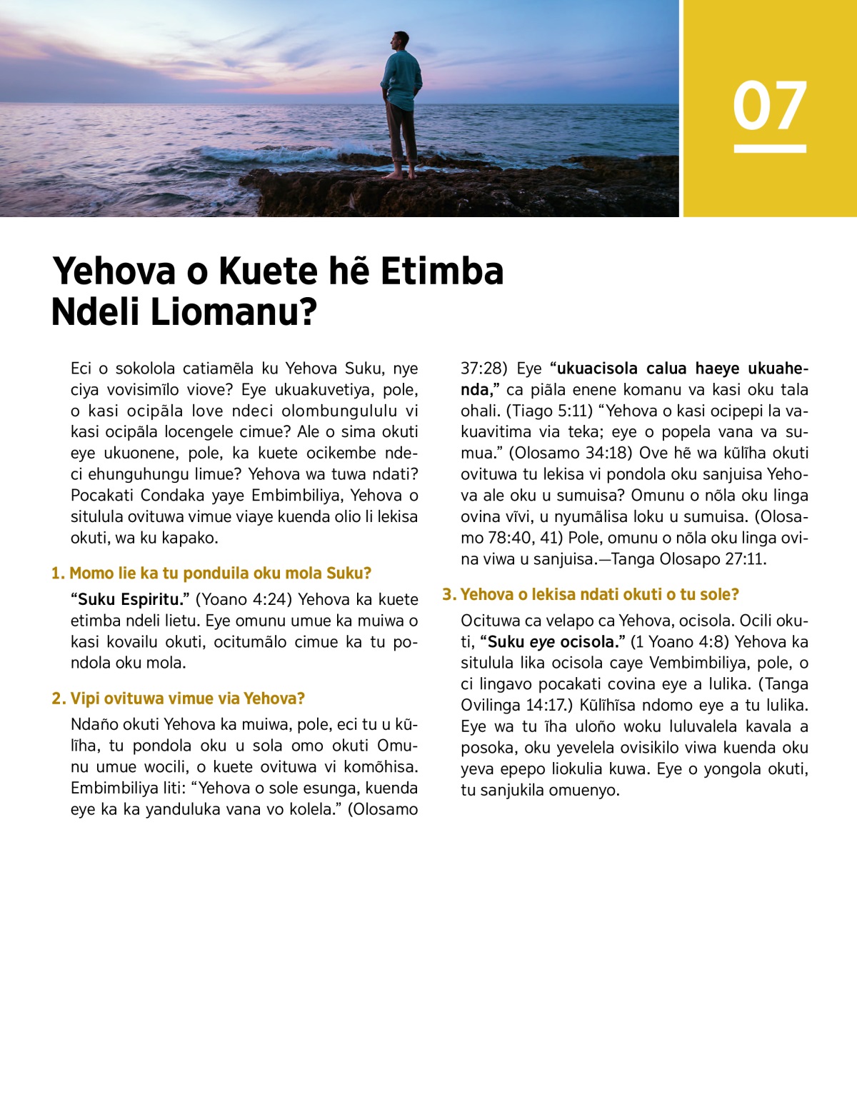 “Suku Espiritu.” (Yoano 4:24) Yehova ka kuete etimba ndeli lietu. Eye omunu umue ka muiwa o kasi kovailu okuti, ocitumãlo cimue ka tu pondola oku mola.