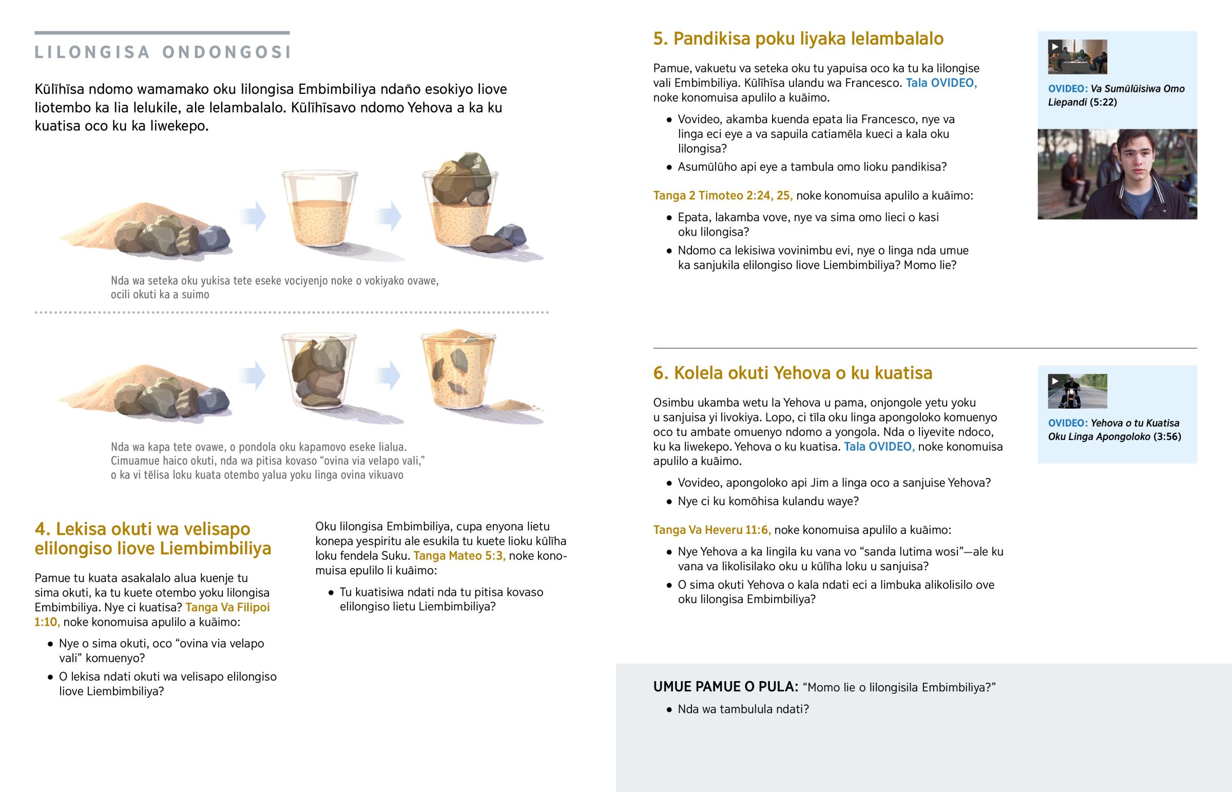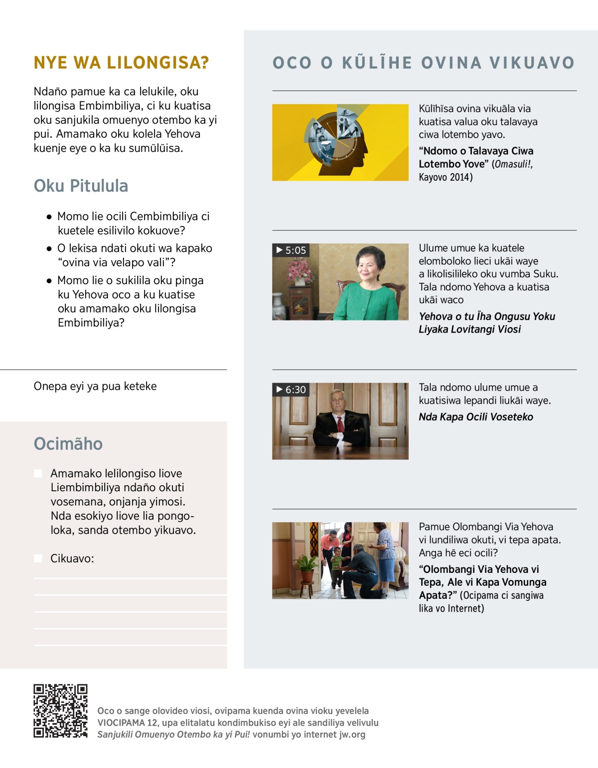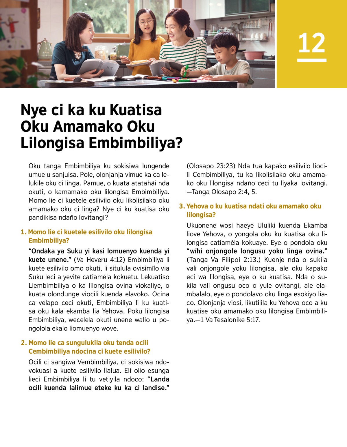 “Ondaka ya Suku yi kasi lomuenyo kuenda yi kuete unene.” (Va Heveru 4:12) Embimbiliya li kuete esilivilo omo okuti, li situlula ovisimĩlo via Suku leci a yevite catiamẽla kokuetu. Lekuatiso Liembimbiliya o ka lilongisa ovina viokaliye, o kuata olondunge viocili kuenda elavoko. Ocina ca velapo ceci okuti, Embimbiliya li ku kuatisa oku kala ekamba lia Yehova. Poku lilongisa Embimbiliya, wecelela okuti unene walio u pongolola ekalo liomuenyo wove.
