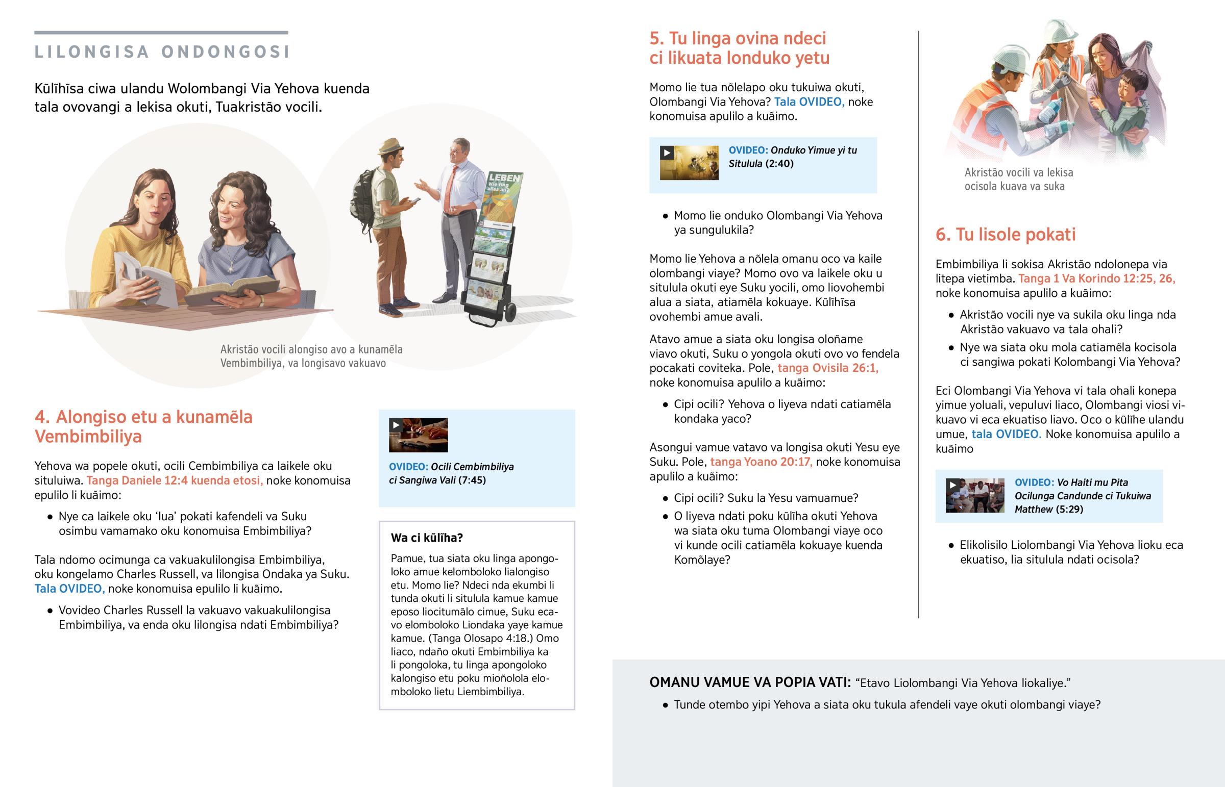 Olombangi Via Yehova Akristão vocili. Tuepata limue voluali luosi liafendeli vana okuti, alongiso etu a kunamẽla Vembimbiliya kuenda tu sapula ocili catiamẽla ku Yehova.