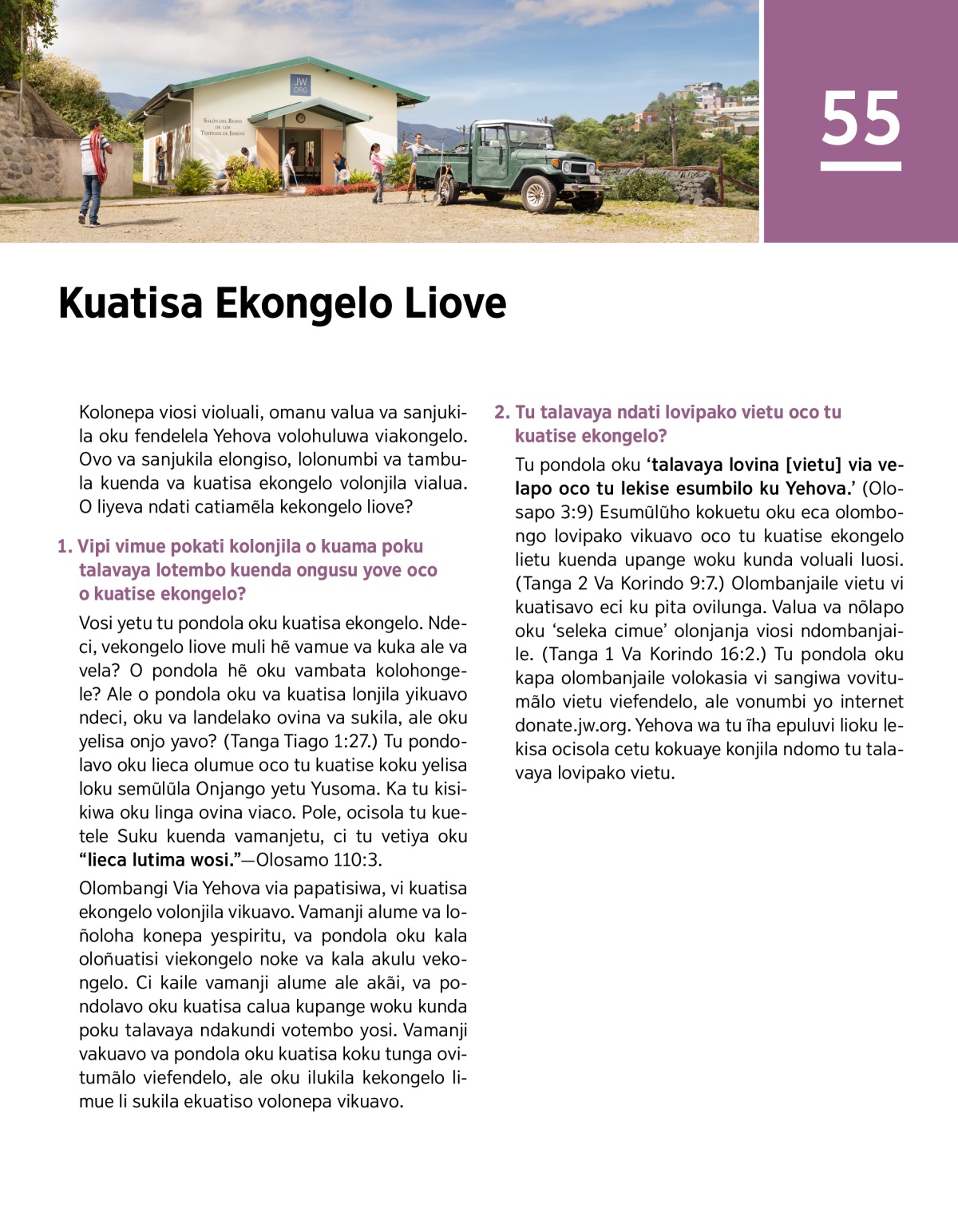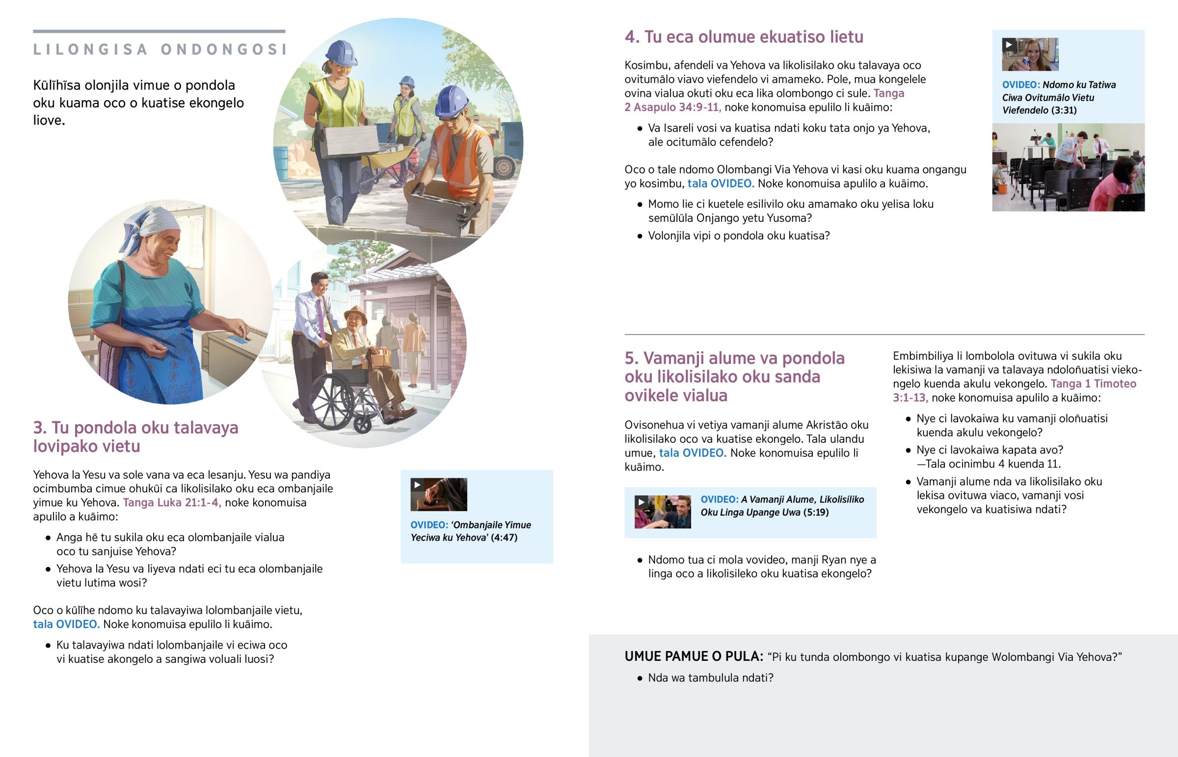 Vosi yetu tu pondola oku kuatisa ekongelo. Ndeci, vekongelo liove muli hẽ vamue va kuka ale va vela? O pondola hẽ oku vambata kolohongele? Ale o pondola oku va kuatisa lonjila yikuavo ndeci, oku va landelako ovina va sukila, ale oku yelisa onjo yavo? (Tanga Tiago 1:27.) Tu pondolavo oku lieca olumue oco tu kuatise koku yelisa loku semũlũla Onjango yetu Yusoma. Ka tu kisikiwa oku linga ovina viaco. Pole, ocisola tu kuetele Suku kuenda vamanjetu, ci tu vetiya oku “lieca lutima wosi.”—Olosamo 110:3.