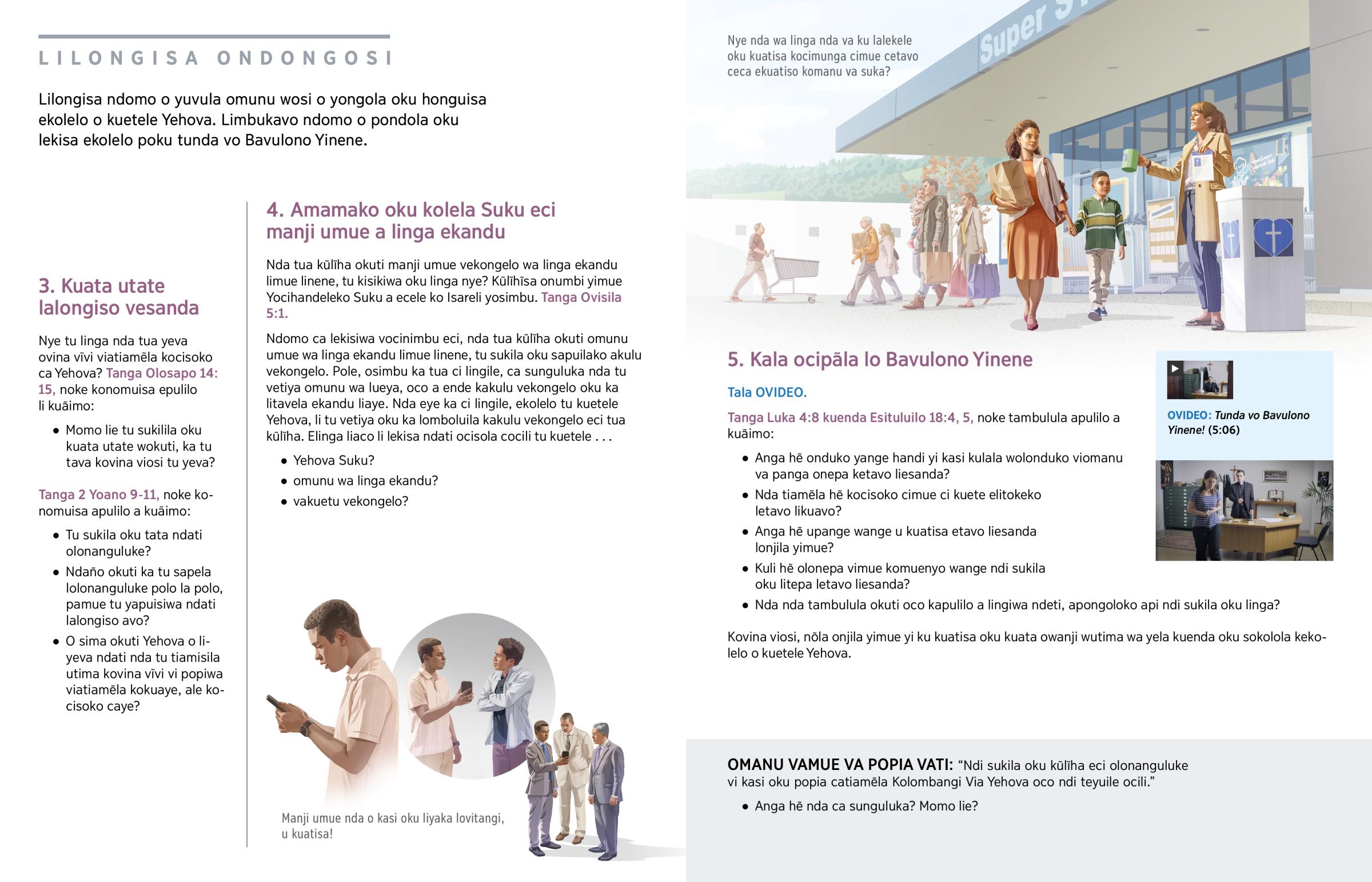 Ocisola tu kuetele Yehova, ci tu vetiya oku yuvula ovina viosi vietavo liesanda. Eci ci lekisa okuti, ka tu pangi onepa kocisoko lacimue ci kuete elitokeko letavo liesanda. Vovina viaco mua kongela upange wetu la vikuavo. Yehova o tu lungula hati: “Amanu vange, tundimo [vo Bavulono Yinene].”—Esituluilo 18:2, 4.
