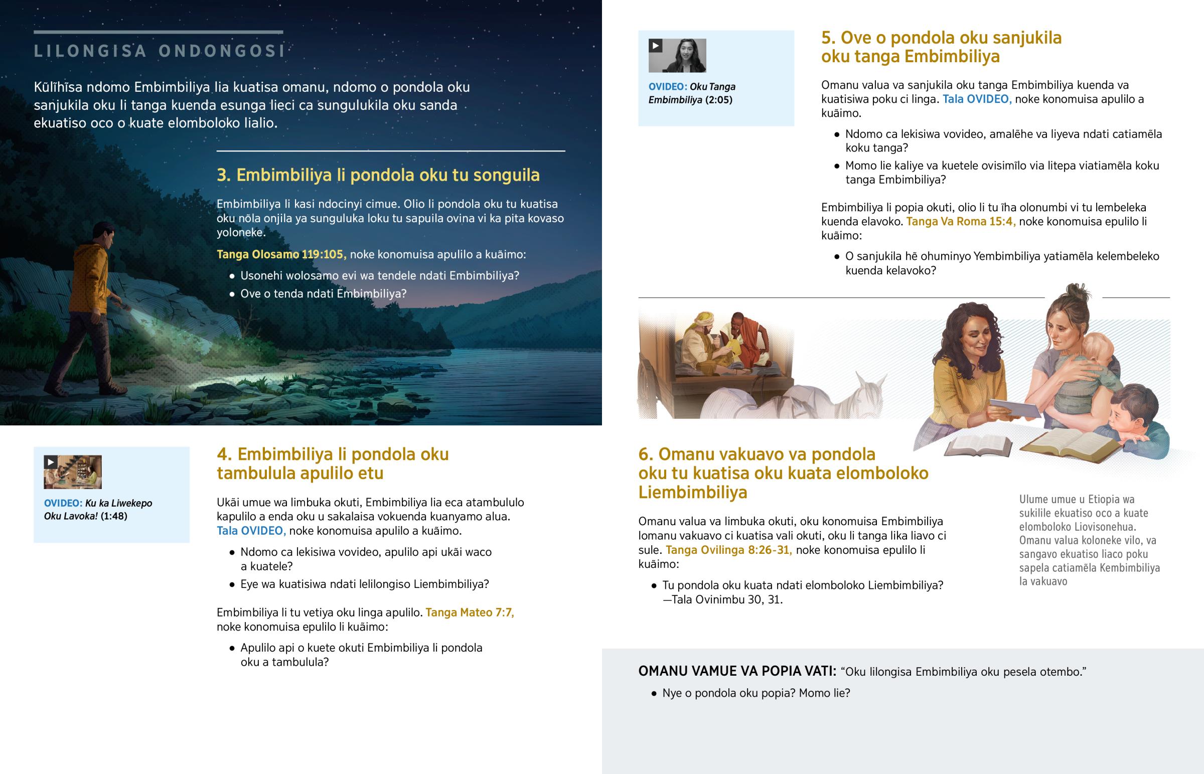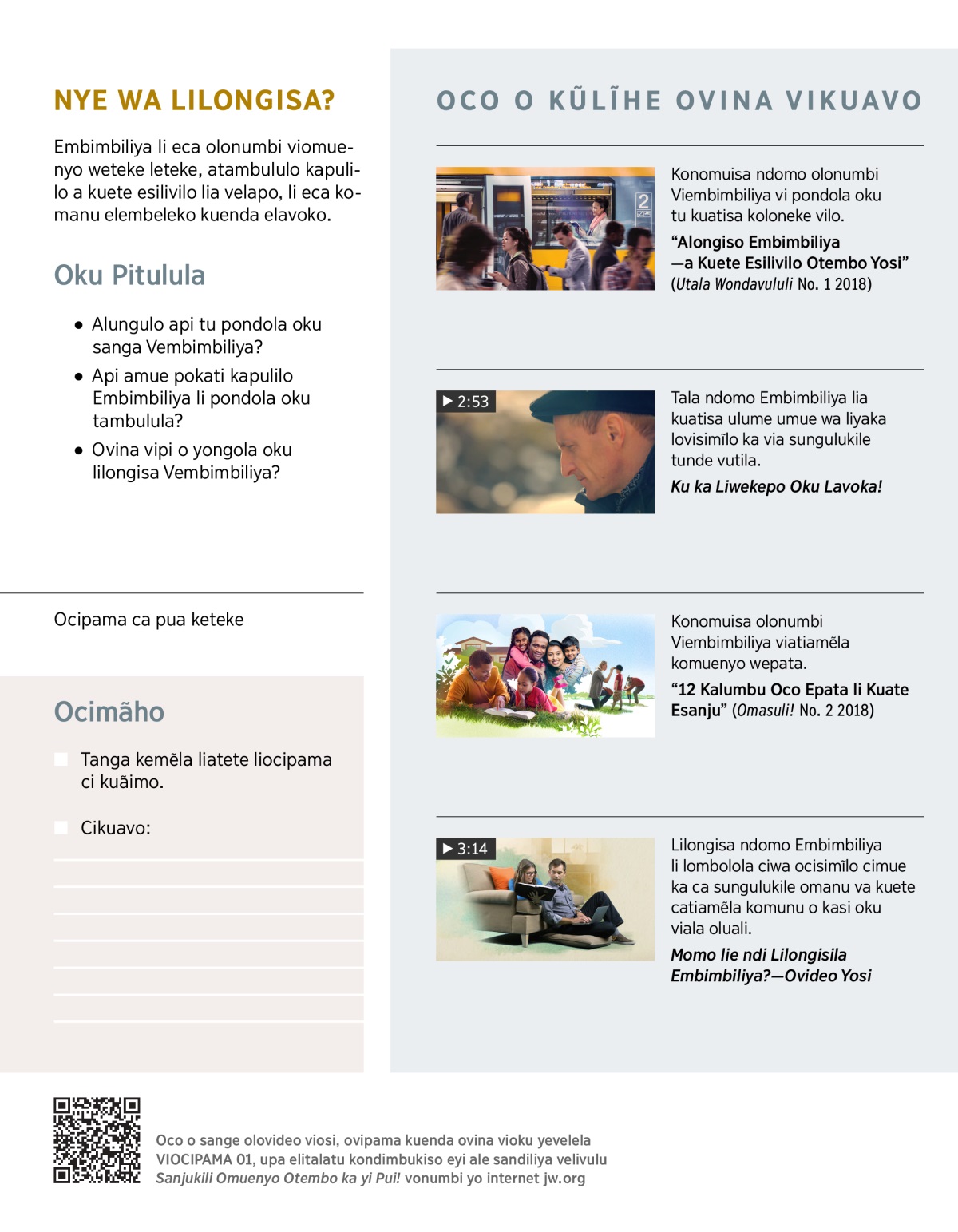 Ombrochura yilo ka yi piñainya Embimbiliya. Pole, oyo yi ku vetiya oku konomuisa lutate Embimbiliya. Omo liaco, tu ku vetiya oku tanga ovisonehua via tukuiwa vovipama viaco kuenda vi sokisa leci o kasi oku lilongisa.
