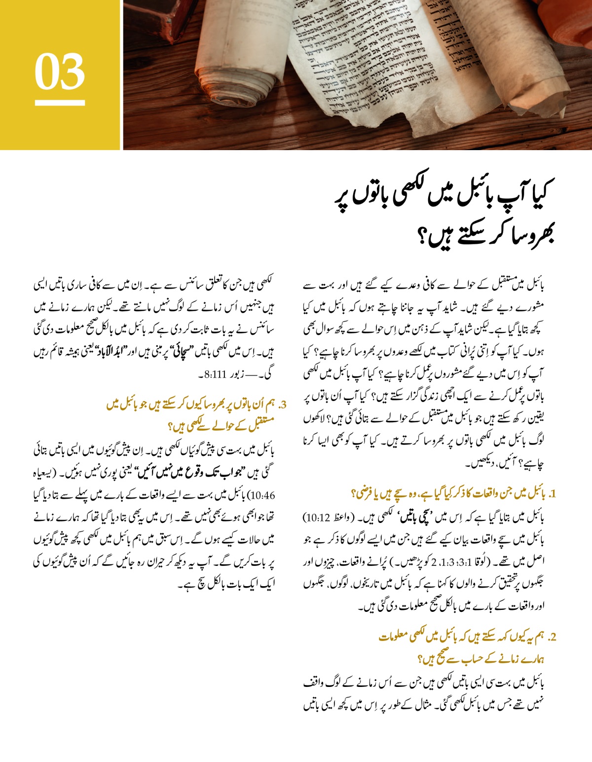 بائبل میں لکھی باتیں تاریخ اور سائنس کے لحاظ سے صحیح ہیں اور اِس میں درج پیشگوئیاں سچی ہیں۔ اِس لیے ہم بائبل پر بھروسا کر سکتے ہیں۔
