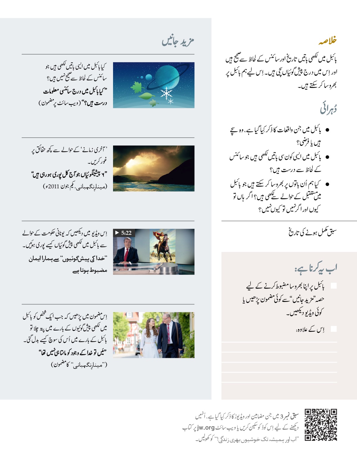 بائبل میں مستقبل کے حوالے سے کافی وعدے کیے گئے ہیں اور بہت سے مشورے دیے گئے ہیں۔ شاید آپ یہ جاننا چاہتے ہوں کہ بائبل میں کیا کچھ بتایا گیا ہے۔ لیکن شاید آپ کے ذہن میں اِس حوالے سے کچھ سوال بھی ہوں۔ کیا آپ کو اِتنی پُرانی کتاب میں لکھے وعدوں پر بھروسا کرنا چاہیے؟ کیا آپ کو اِس میں دیے گئے مشوروں پر عمل کرنا چاہیے؟ کیا آپ بائبل میں لکھی باتوں پر عمل کرنے سے ایک اچھی زندگی گزار سکتے ہیں؟ کیا آپ اُن باتوں پر یقین رکھ سکتے ہیں جو بائبل میں مستقبل کے حوالے سے بتائی گئی ہیں؟ لاکھوں لوگ بائبل میں لکھی باتوں پر بھروسا کرتے ہیں۔ کیا آپ کو بھی ایسا کرنا چاہیے؟ آئیں، دیکھیں۔