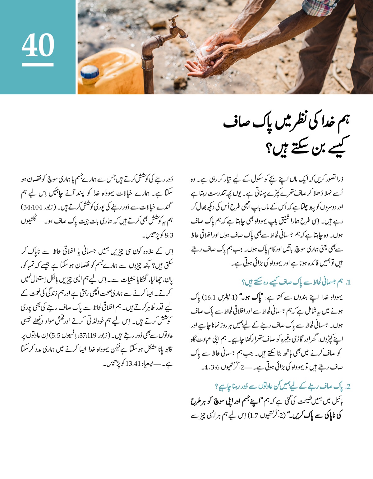ذرا تصور کریں کہ ایک ماں اپنے بچے کو سکول کے لیے تیار کر رہی ہے۔ وہ اُسے نہلا دُھلا کر صاف ستھرے کپڑے پہناتی ہے۔ یوں بچہ تندرست رہتا ہے اور دوسروں کو پتہ چلتا ہے کہ اُس کے ماں باپ اچھی طرح اُس کی دیکھبھال کر رہے ہیں۔ اِسی طرح ہمارا شفیق باپ یہوواہ بھی چاہتا ہے کہ ہم پاک صاف ہوں۔ وہ چاہتا ہے کہ ہم جسمانی لحاظ سے بھی پاک صاف ہوں اور اخلاقی لحاظ سے بھی یعنی ہماری سوچ، باتیں اور کام پاک ہوں۔ جب ہم پاک صاف رہتے ہیں تو ہمیں فائدہ ہوتا ہے اور یہوواہ کی بڑائی ہوتی ہے۔