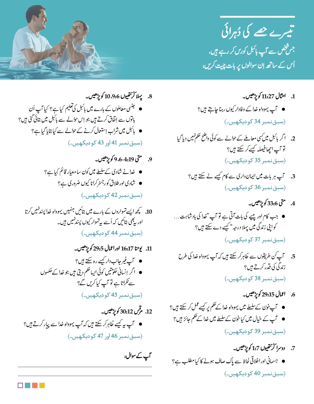 جس شخص سے آپ بائبل کورس کر رہے ہیں، اُس کے ساتھ اِن سوالوں پر باتچیت کریں: