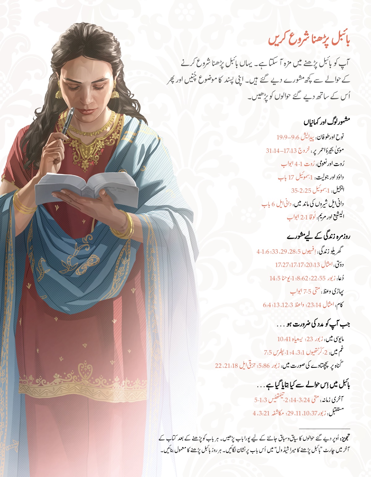 تجویز: اُوپر دیے گئے حوالوں کا سیاقوسباق جاننے کے لیے پورا باب پڑھیں۔ ہر باب کو پڑھنے کے بعد کتاب کے آخر میں چارٹ ”بائبل پڑھنے کا میرا شیڈول“ میں اُس باب پر نشان لگائیں۔ ہر روز بائبل پڑھنے کا معمول بنائیں۔